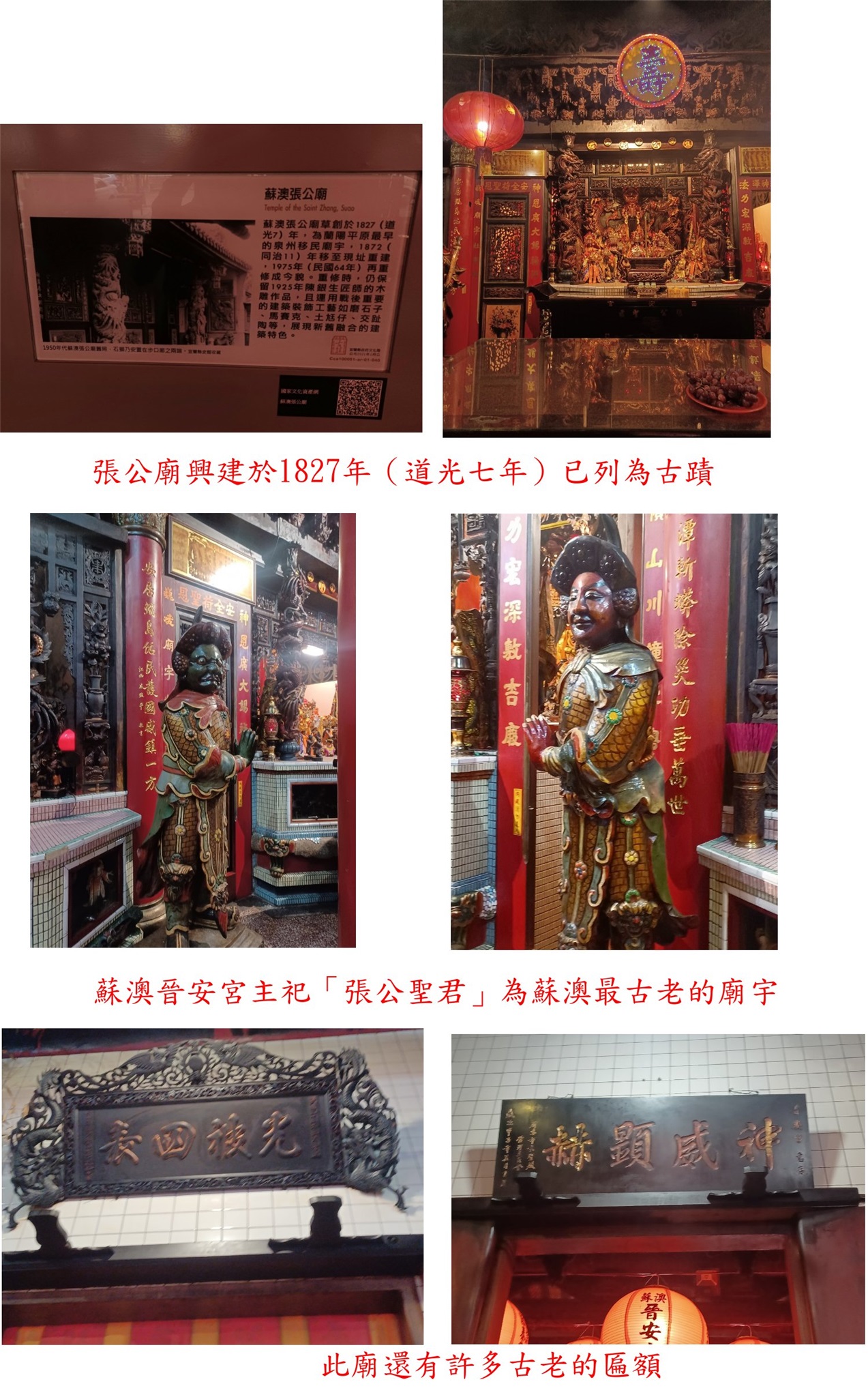 蘇澳晉安宮主祀「張公聖君」,故在地方上一般稱為「張公廟」,亦稱「法主公」,是福建泉州永春、安溪一帶之地方守護神;此廟於1827年(道光七年)由蘇士尾、張光明等建祠奉祀,以鎮壓蠻荒瘴癘,廟方仍保留有一幅寫著開墾先賢姓名的藍染布,廟的捐題碑記已成為右廂臺階石;1872年(同治十一年)遷建現址,二年後提督羅大春駐紮蘇澳,在廟旁興建義學,興建瓦屋草舍五間作為授課學堂,是蘇澳鎮興學之始,後庄民立羅提督興學碑於廟前;後來義學又成為台澎兵備道兼提督的屯營講武之所,原先放於七星嶺冷泉溪畔的羅提督里程碑也置於此廟(這二塊石碑有仿製品置於其旁);1975年廟宇重建後,成單殿三開間,仍保留1925年陳銀生的作品,清治與大正年間重修石柱單殿三開間、蘇澳神社石燈籠、蘇澳西本願寺的古鐘與缽等,放置於廟宇右側牆邊的角落,另此廟還有許多古老的匾額;此廟為蘇澳最古老的廟宇,於2020年登錄為宜蘭縣古蹟。