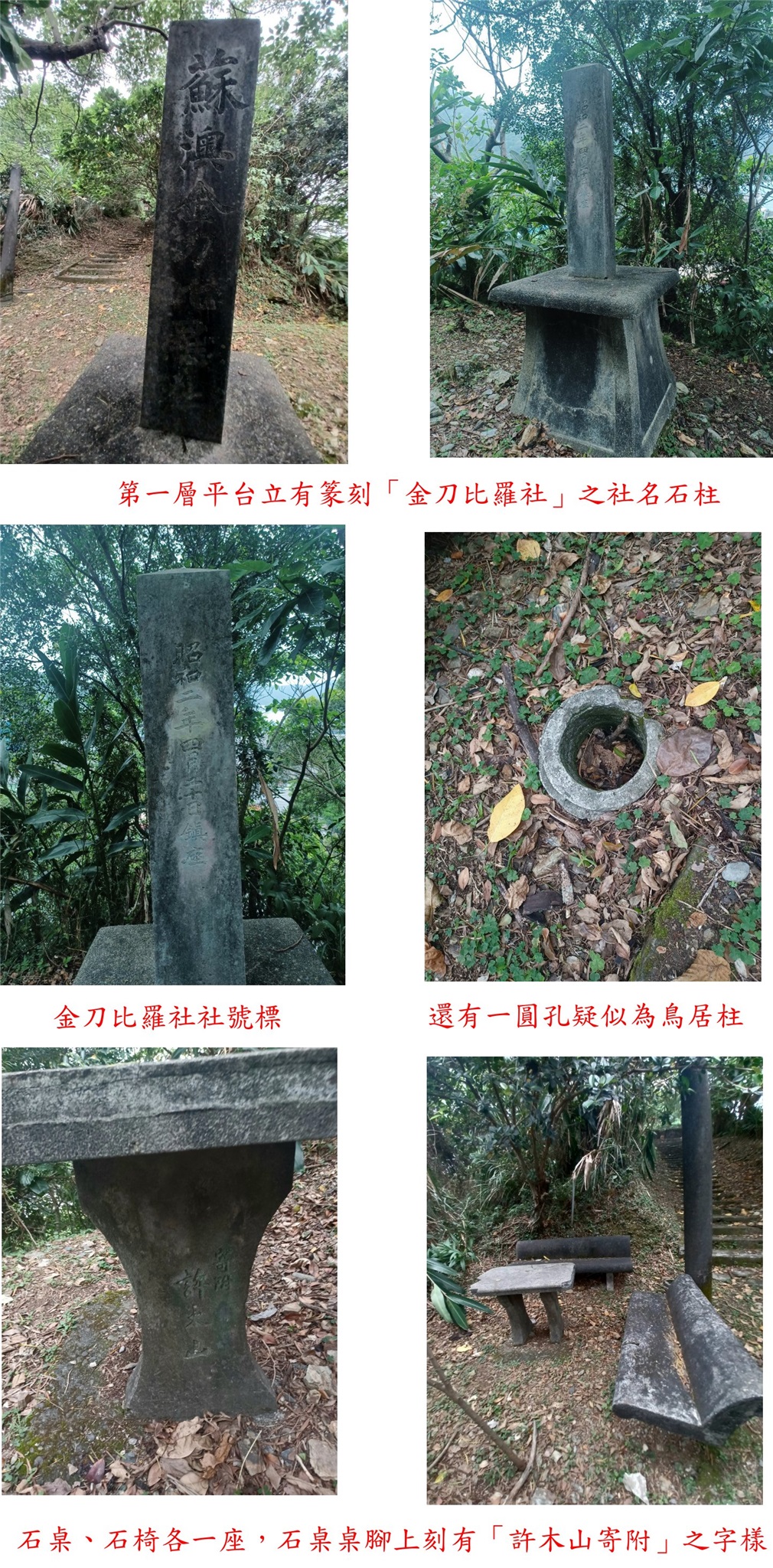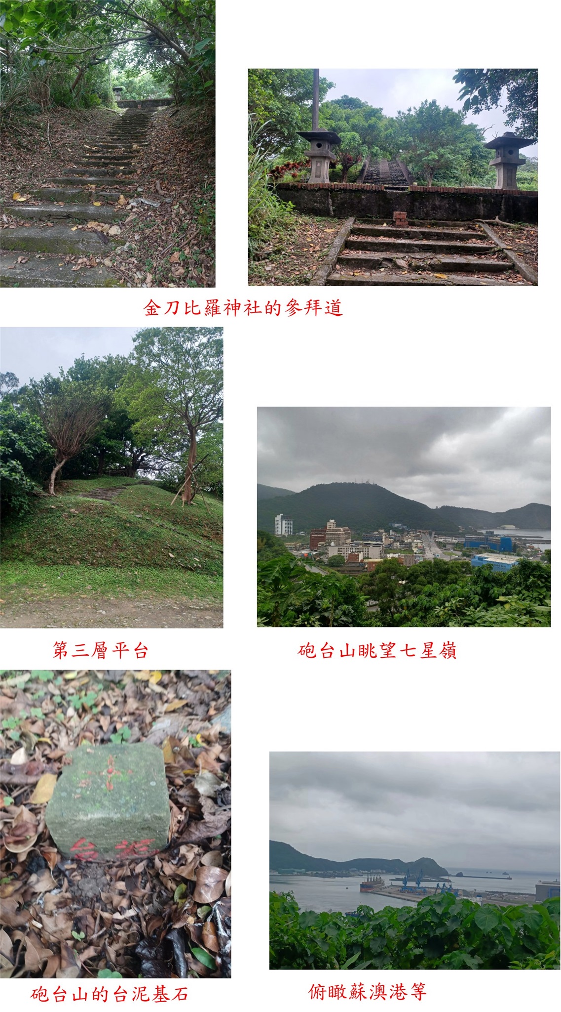 4/5早上來蘇澳的砲台山尋訪金刀比羅神社,首先來到「天君廟」,廟前留存有神社的一對石燈籠基底,分別有昭和四年與昭和六年的字樣,廟前的石獅基座為金刀比羅神社的石燈籠座,此廟主祀王天君,陪祀有觀世音菩薩、福德正神、天上聖母;接著來到砲台山,現仍有石柱、石桌、石椅、石燈籠及神社正殿基座等神社遺構,神社原址公分4個平台,第一層平台立有篆刻「金刀比羅社」之社名石柱一座及石桌、石椅各一座,石桌桌腳上刻有「許木山寄附」之字樣,還有一圓孔疑似為鳥居柱;第二層平台立有石燈籠一對,燈籠上刻有圓形及新月形之鏤空圖案,有台北州七星郡的人所奉獻字樣;第三層平台作為石梯轉向之轉換空間。第四層平台原為神社正殿所在,現在僅存基座遺址,取而代之的是獅子會『同心協力.發揚獅子精神』雕塑,旁還有顆「台泥」基石;另砲台山還有一座「警察遭難紀念碑」,砲台山來過多次,以前不知有神社遺址,為了金刀比羅神社造度造訪。