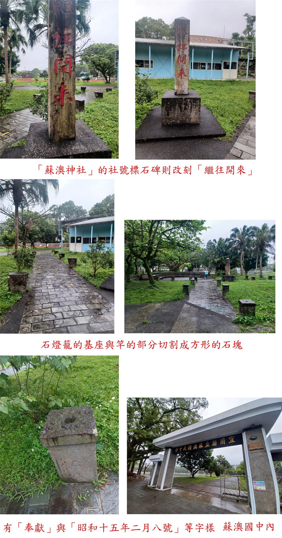 4/5先前往蘇澳國中由校門進入,於操場右側教室前方見到繼往開來的石碑,此碑即為蘇澳神社的社號標,字跡被塗抹後刻上「繼往開來」的字樣;四周散落著十幾塊石燈籠的基座與竿的部分切割成方形的石塊,圍繞著石碑可當成石椅,刻有「奉獻」與「昭和十五年二月八號」等字樣;再來到蘇澳的晉安宮尋找蘇澳神社遷移過來的遺構,牌樓下方的石獅為廟宇所屬非古物,另廟門口的一對石獅,有可能為蘇澳神社的狛犬,石燈籠竿的部分放置於廟右側牆邊,與一堆石柱與石碑等再一起。