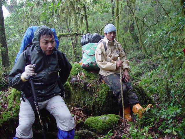 至入山口 2257M,下車吃午餐,豆大雨滴直直落,來不及穿上雨衣就轉為傾盆大雨。嚮導阿吉臉色沉重,交代司機五天後,如果看見村裡的溪水高漲,便到此處接人(這豈不意味我們得折返?),否則就在原定的多納村碰面。原本應該是嚮導之一的司機,改由他才十七歲的兒子跟我們入山,小孫第一次在山裡這麼多天,似乎爸爸是要他來磨練磨練的。