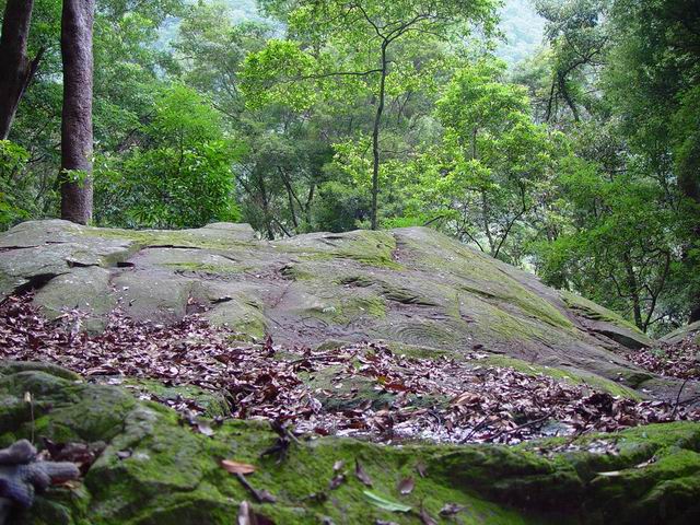 爬上近70度的險崖後,地勢較平緩,懸崖上方的森林由於位置險峻,還保持原生林的樣態,樹齡大概超過五百年了。穿過一片巨大黃杞樹林,踏著厚厚的腐植層落葉後,密林中忽見一片開闊的光影,一顆長滿青苔的巨石出現眼前,頓時高興的天旋地轉,不禁飛奔而去。