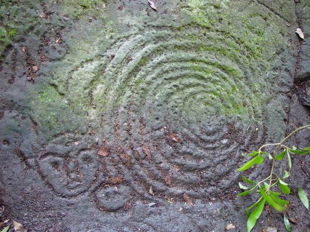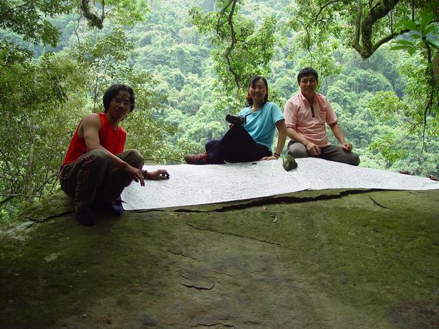 三人有默契的脫下鞋,用樹枝葉掃去落英黃葉,神秘的岩雕一一出現。我們決定不刮去青苔,以保有它生於自然的面貌。接著老高、旺旺拿出準備好的棉紙、蠟墨以乾式拓法拓印,我則拍攝岩石上的各種紋樣和他們專心工作的容顏,並開始測量記錄。小孫躺在石上睡覺,阿吉抽著煙,天地寂靜,各自點滴在心頭。 1364M