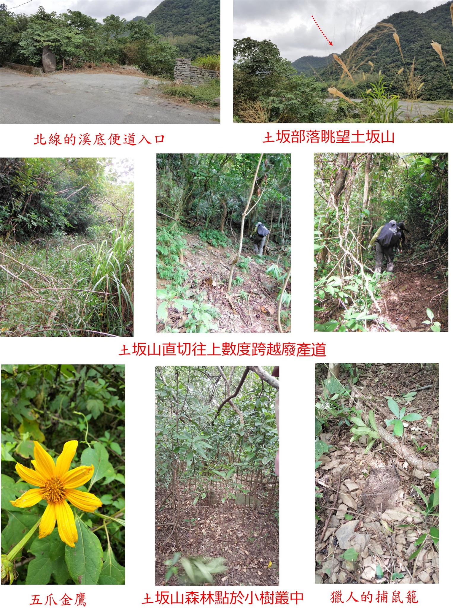 由部落內的東68線7.25K叉路取左續行過土坂吊橋至9.1K的新興橋前叉路【0K】,不過橋左轉西線的溪畔產道盤繞往上至2.3K水泥路終點,此產道繞經565峰南面,續行至土石路至3.3K叉路,此段土石路路況超差開的心驚膽戰、只能硬著頭皮往前、轉下坡至5.6K二線交會的叉路,此路口即土坂山登山口;接到部落溪底便道上來的道路,右為土石路,取左往部落的水泥路走