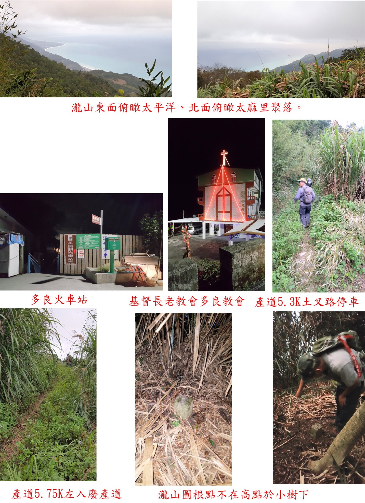 由呀里叭山原路回至台9線422.7K叉路,左轉台9線北向走5.2K叉路(417.5K處),路口有多良火車站與太麻里瀧部落指標;取左多良產道上坡走0.25K右為多良火車站,續盤繞往上至0.8K部落叉路,左上亦可通往部落不取;取直主線續行至0.9K叉路,直行亦可,左轉主線進入瀧部落至1.15K叉路,左下出0.8K叉路不取;取右主線至1.3K叉路,左上往教堂路較小不取,取直主線經基督長老教會多良教會至1.5K叉路,右下出0.85K叉路不取;取左上至1.9K叉路,左下出部落1.3K叉路不取,取右上至2.05K叉路,右上往開墾地不取;取直產道主線3.1K叉路,左下土路不取,取右上坡路至4.6K叉路,左下仍不取;取右上的主線前行至5.1K叉路,左下水泥路不取,取右上產道至5.3K土叉路停車,高