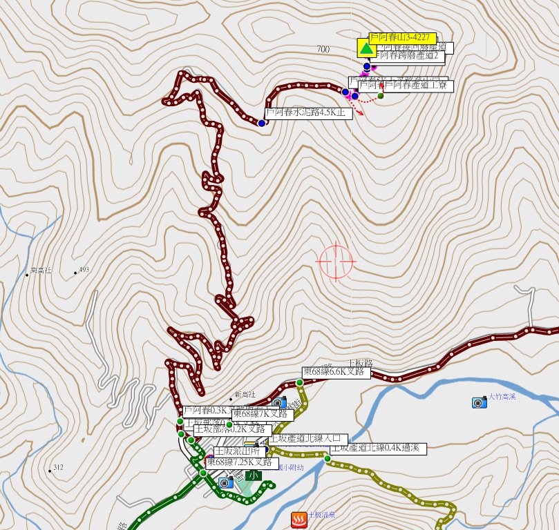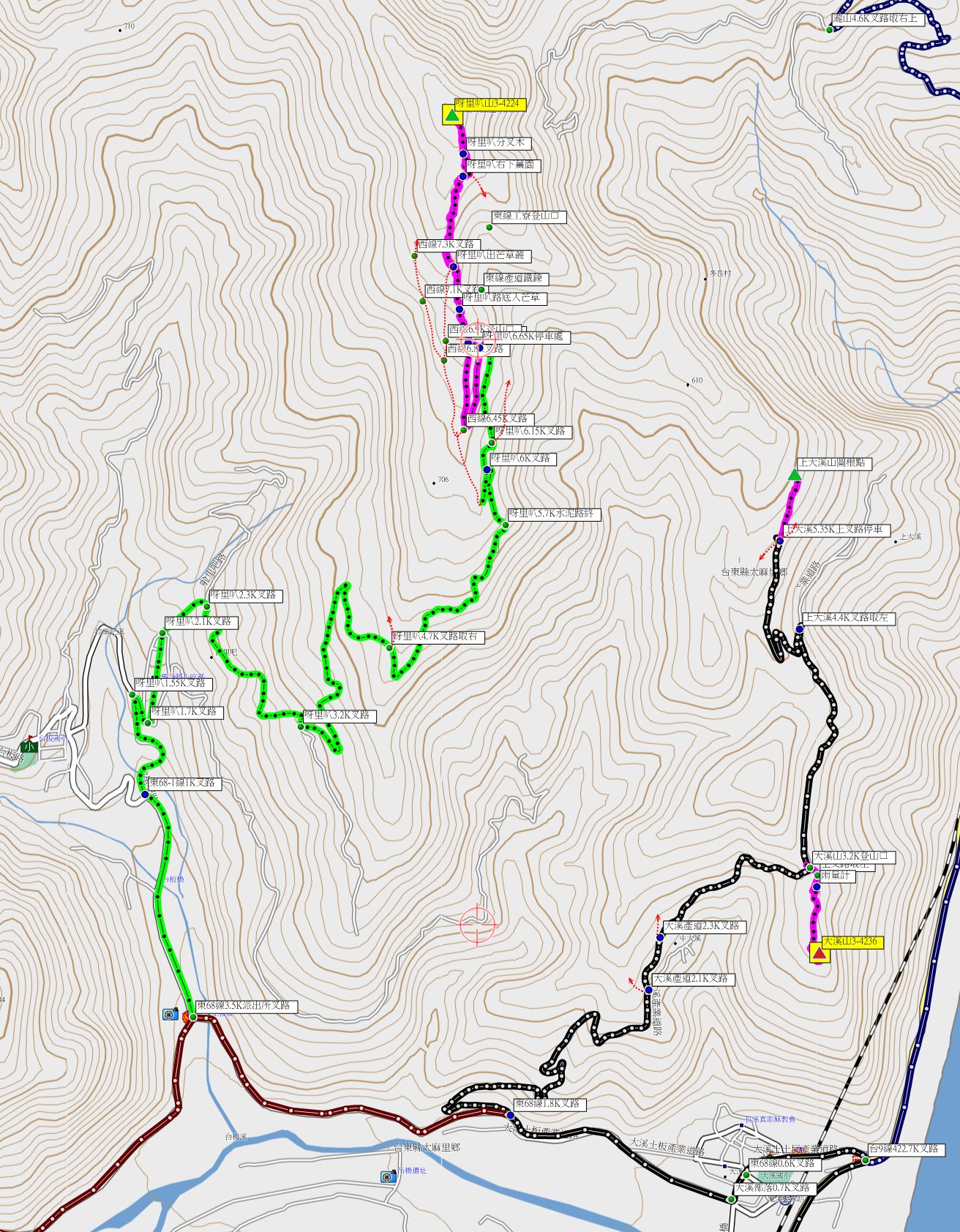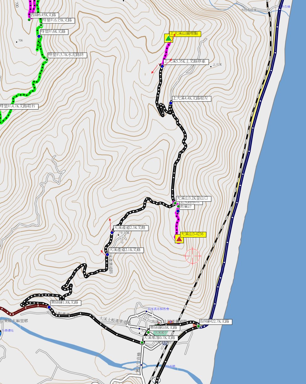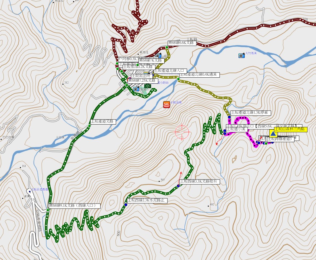 由上大溪山原路回至東68線1.8K叉路,右轉東68線(大溪土坂產道)往土坂走7K至部落前叉路【0K】;右轉部落上方道路走0.2K叉路,右轉走