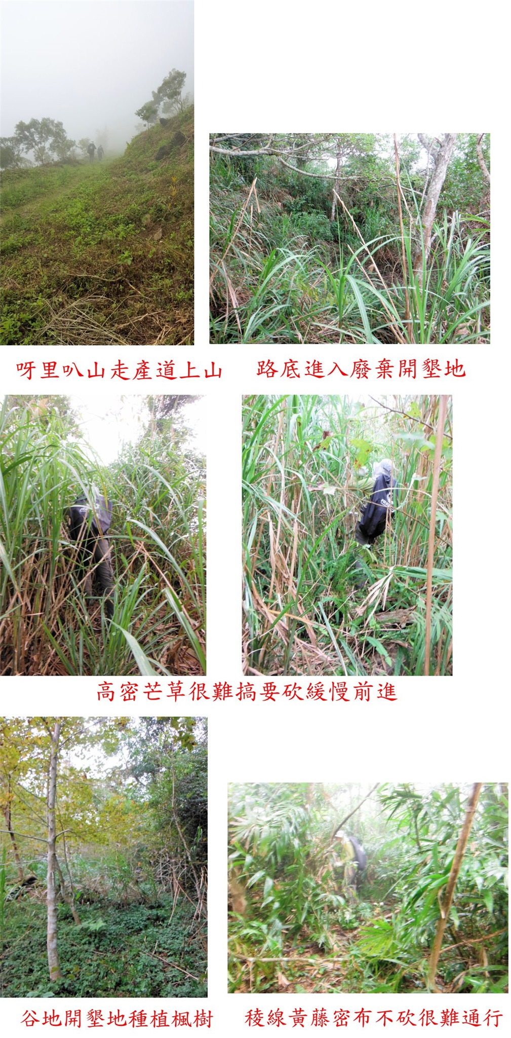 誤取直土路前行走350餘公尺叉路,左出剛才產道6K叉路,右線(即西線)亦可往呀里叭山(應取此線主稜芒草密難走);取右後的稜線土路走