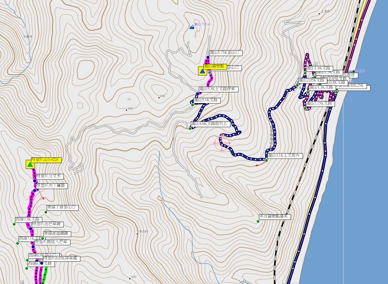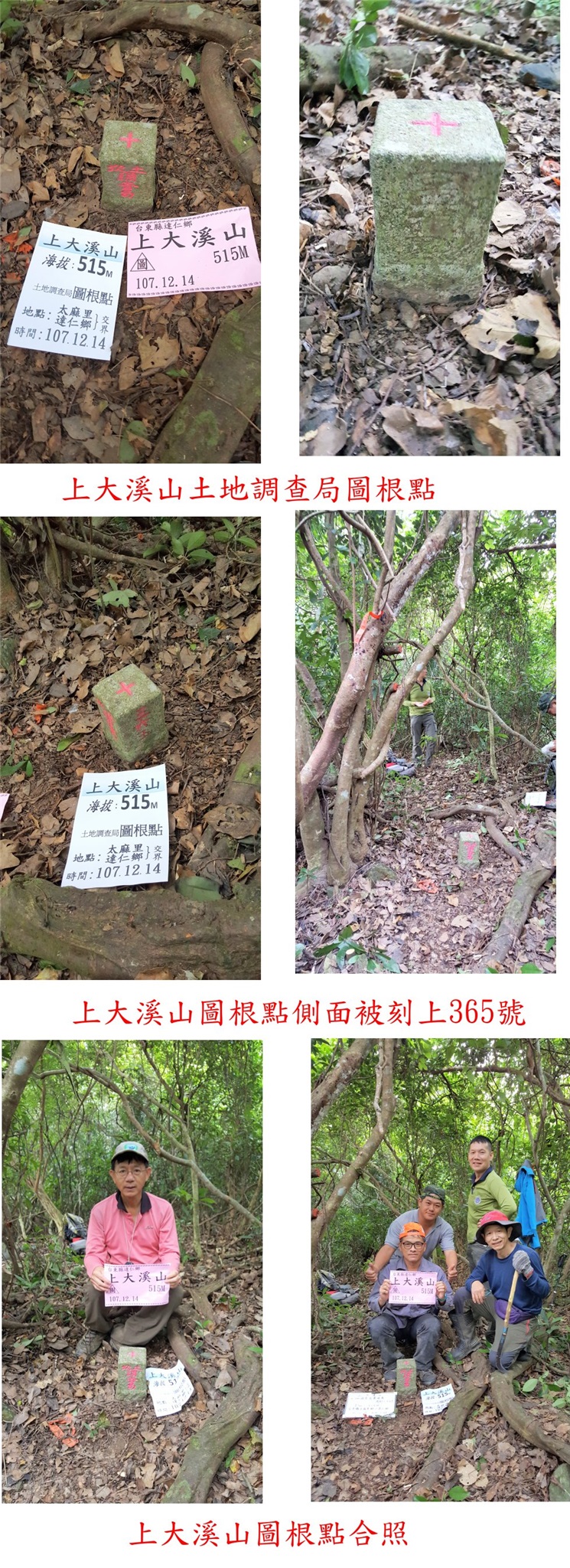 1、上大溪山:位於台東太麻里與達仁交界處,標高515公尺,土地調查局圖根點;座標243201 2487762。