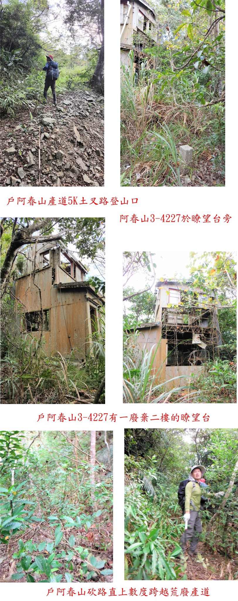 12/13-12/17約山友來屏東與台東登山,第三天(12/15)首先為上大溪山圖根點,將廢產道砍成康莊大道,上山走半小時,此山海景很美;第2座為戶阿春山3-4227,山頂舊時有瞭望台,產道荒廢自己砍路直上,上山走半小時;第3座為土坂山森林點,此山於土坂部落對面要過溪但便橋沖毀,當地人告知另有產道可達,遠繞路況極差的西線土石路心驚膽跳才接回原路,砍路上山走46分鐘登頂,極為荒涼的小山,回程走北線產道發現溪底水量不大車可過溪;第4座為呀里叭山3-4224,此山產道複雜沒找到正路,自行砍路順稜上山,芒草與黃藤密佈難度頗高,接近山頂時發現另有薑園道路(東線)接近山頂,此山自行闢路上山走1小時又42分鐘,比預期難很多;第5座為瀧山圖根點,此山於多良部落上方,產道叉路多很複雜,摸黑上山走16分鐘登頂;今日計有5顆新的基石入帳,其中還有2顆3等基石收穫頗豐。