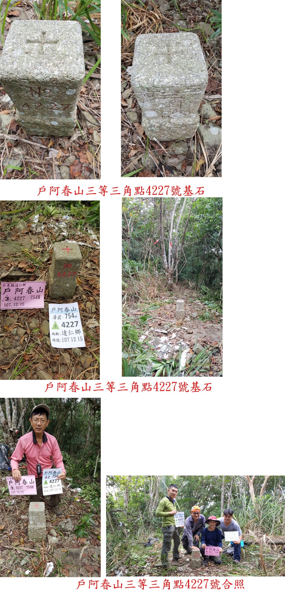2、戶阿春山:位於台東縣達仁鄉,標高754公尺,三等三角點4227號基石;座標238177 2485872。