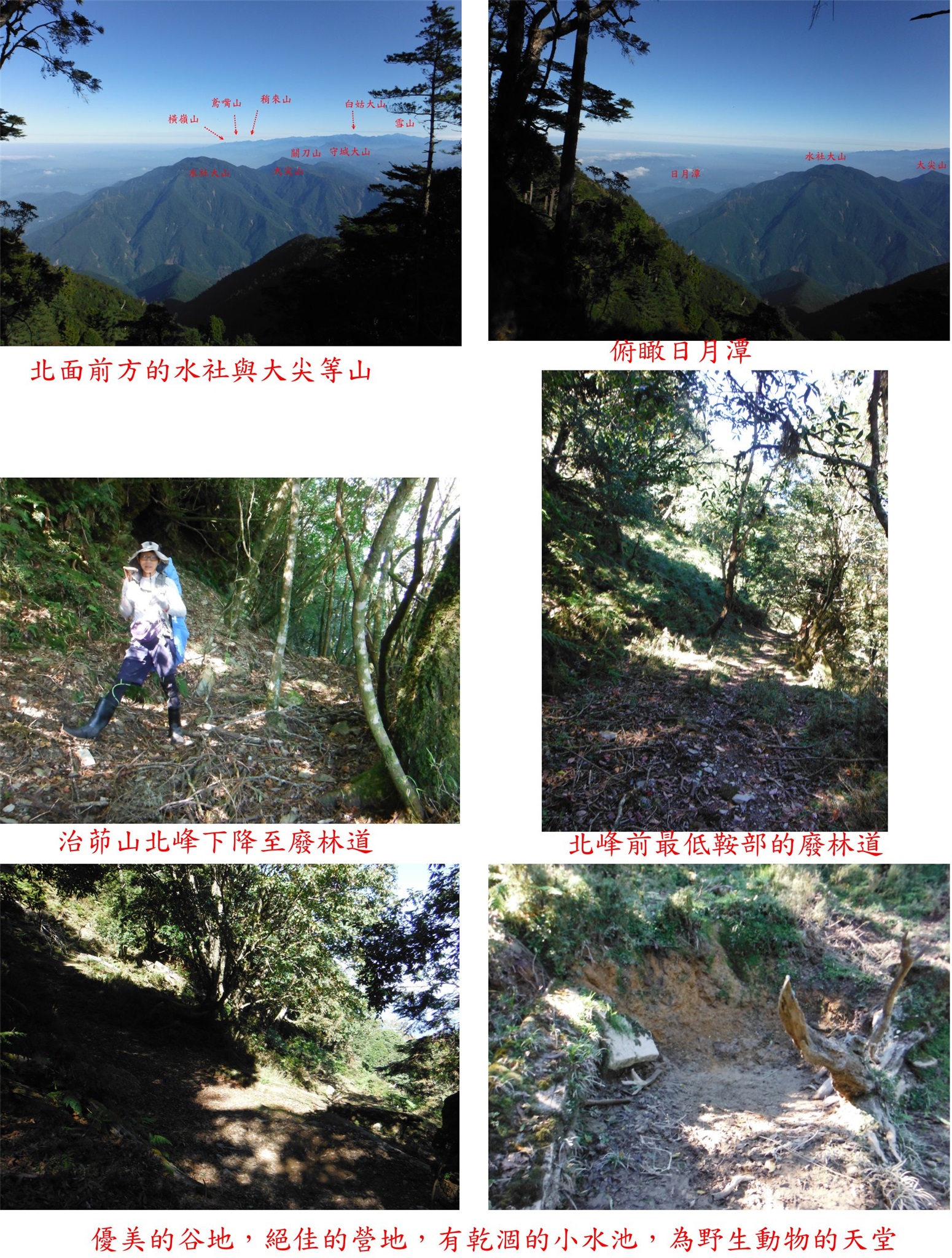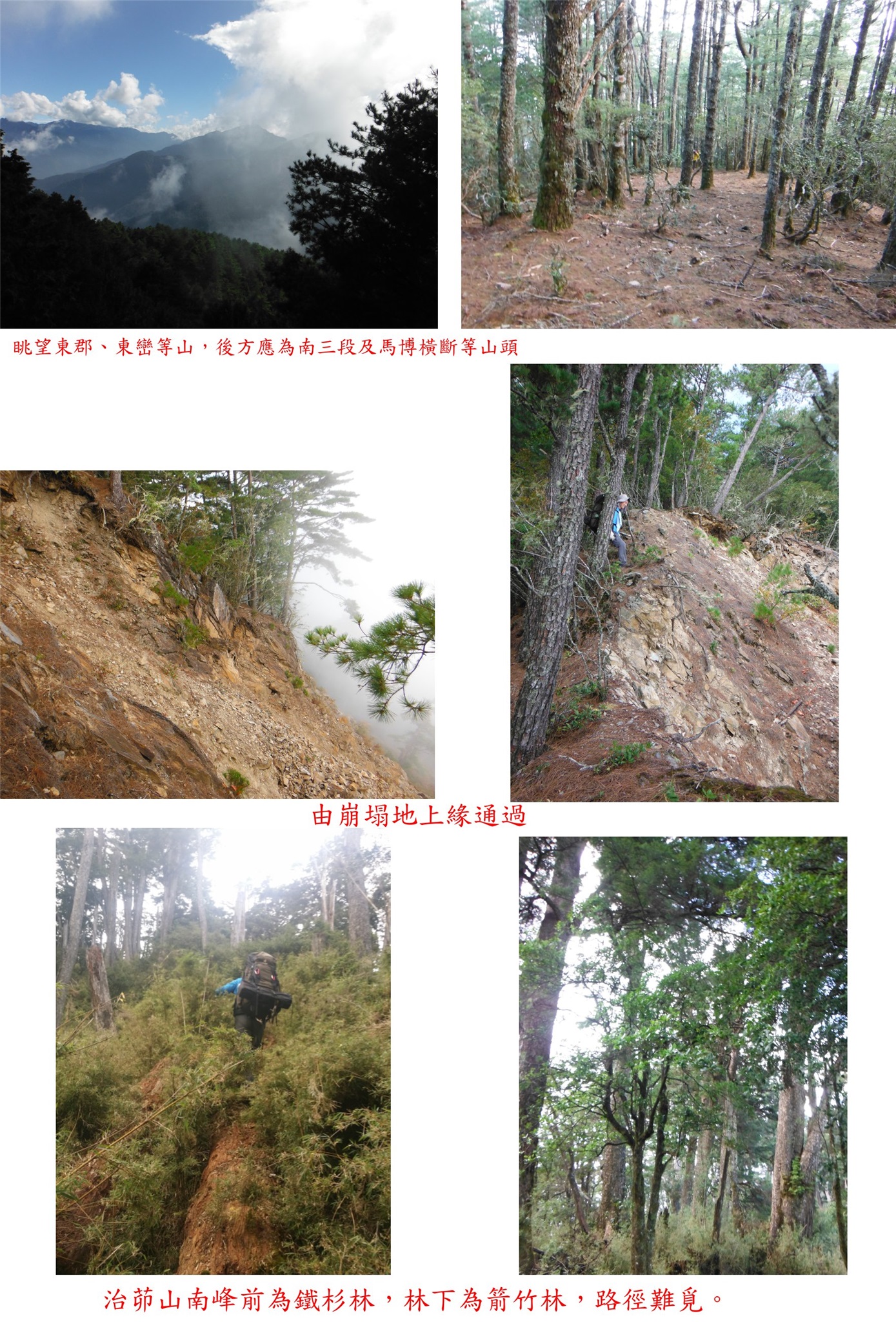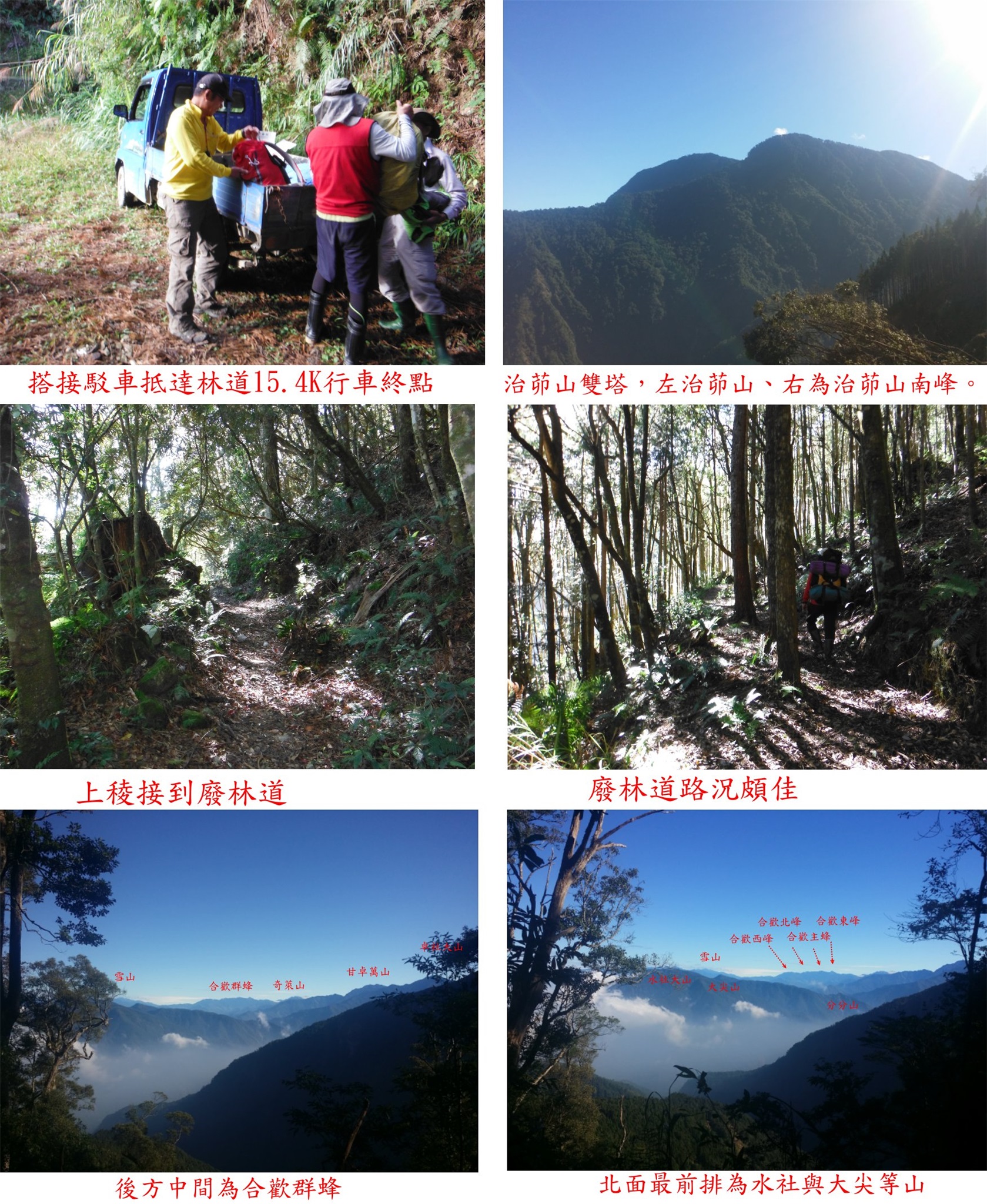 08:30取左廢林道續行,沿途治茆南峰與治茆山的雙塔矗立前方,東北面眺望合歡群峰。