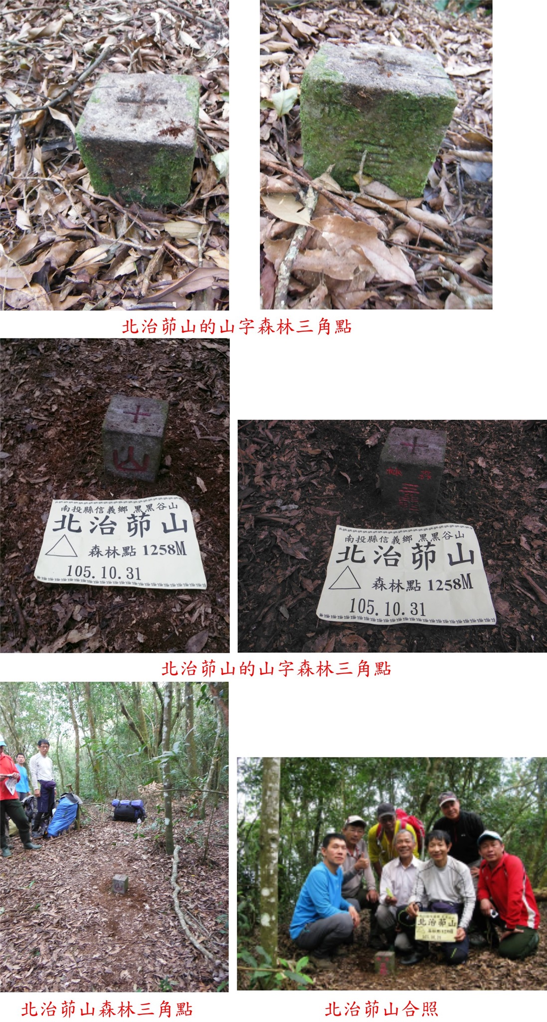 5、北治茆山:又稱黑黑谷山,位於南投縣信義鄉,標高1258公尺,森林三角點;座標247124 2630874。