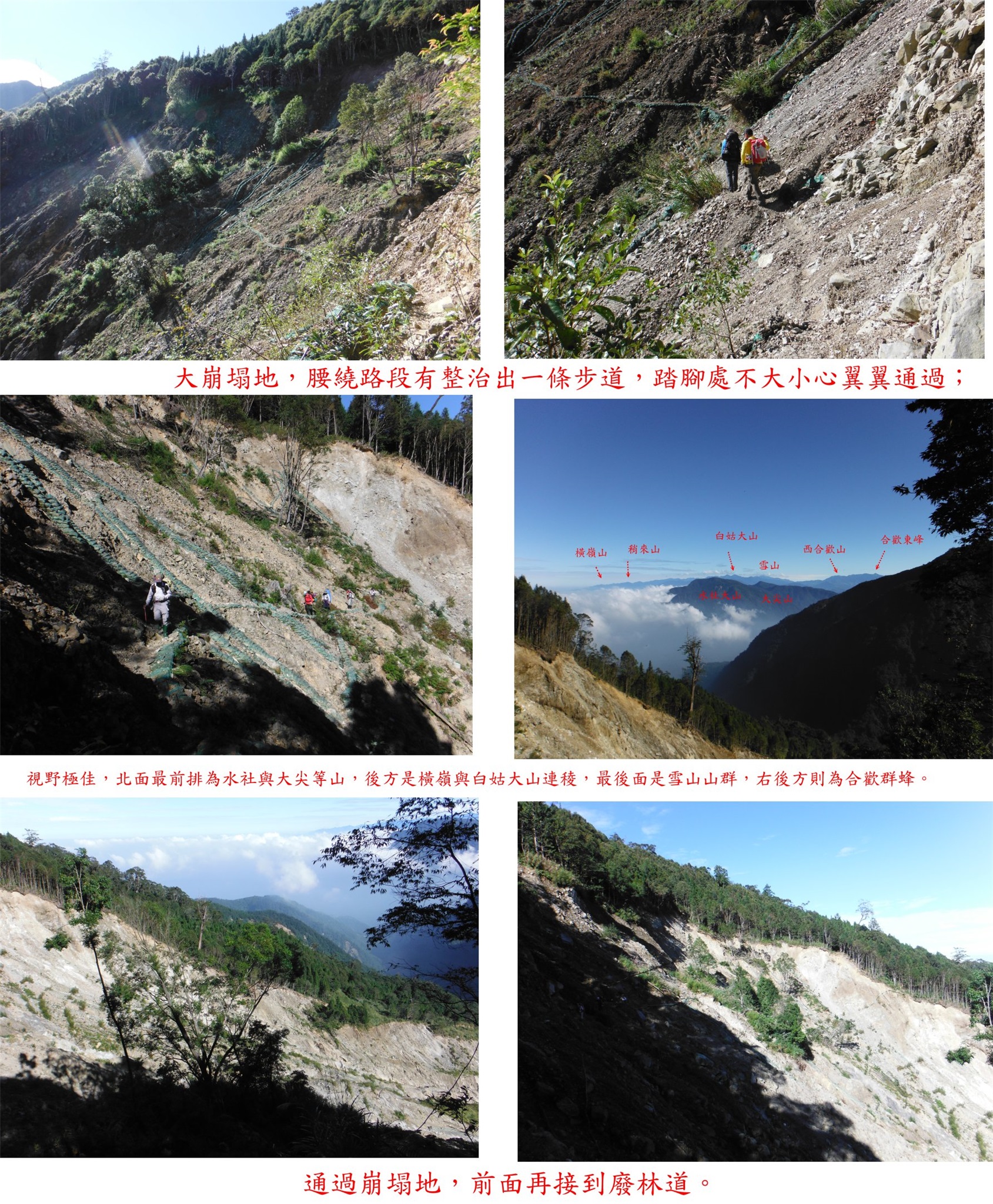 08:49大崩塌地,腰繞路段有整治出一條步道,踏腳處不大小心翼翼通過;視野極佳,北面最前排為水社與大尖等山,後方是橫嶺與白姑大山連稜,最後面是雪山山群,右後方則為合歡群蜂。