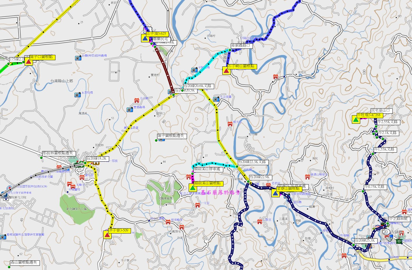 5/24-5/26約山友去台南撿基石,早上去補10顆的平地基石,只有6顆基石入帳,下午去撿平原周遭的小郊山;依序走隙子口、牛稠埔山與石子崎山等3顆圖根點,都只要1分鐘就可輕易入袋;第4座的頭前溪山,有圖根點與曾文溪水源保護區界48號基石等2顆基石,產道崩塌走過去,爬上路旁的山丘竟然找不到基石,順著崩塌地往下找,基石崩落於路旁尙待山友重立;第5座的菜寮山圖根點於路的上方,上去也只要5分鐘輕鬆達陣;今日雖陣雨不斷還是走了15顆基石,計有11顆基石入帳。