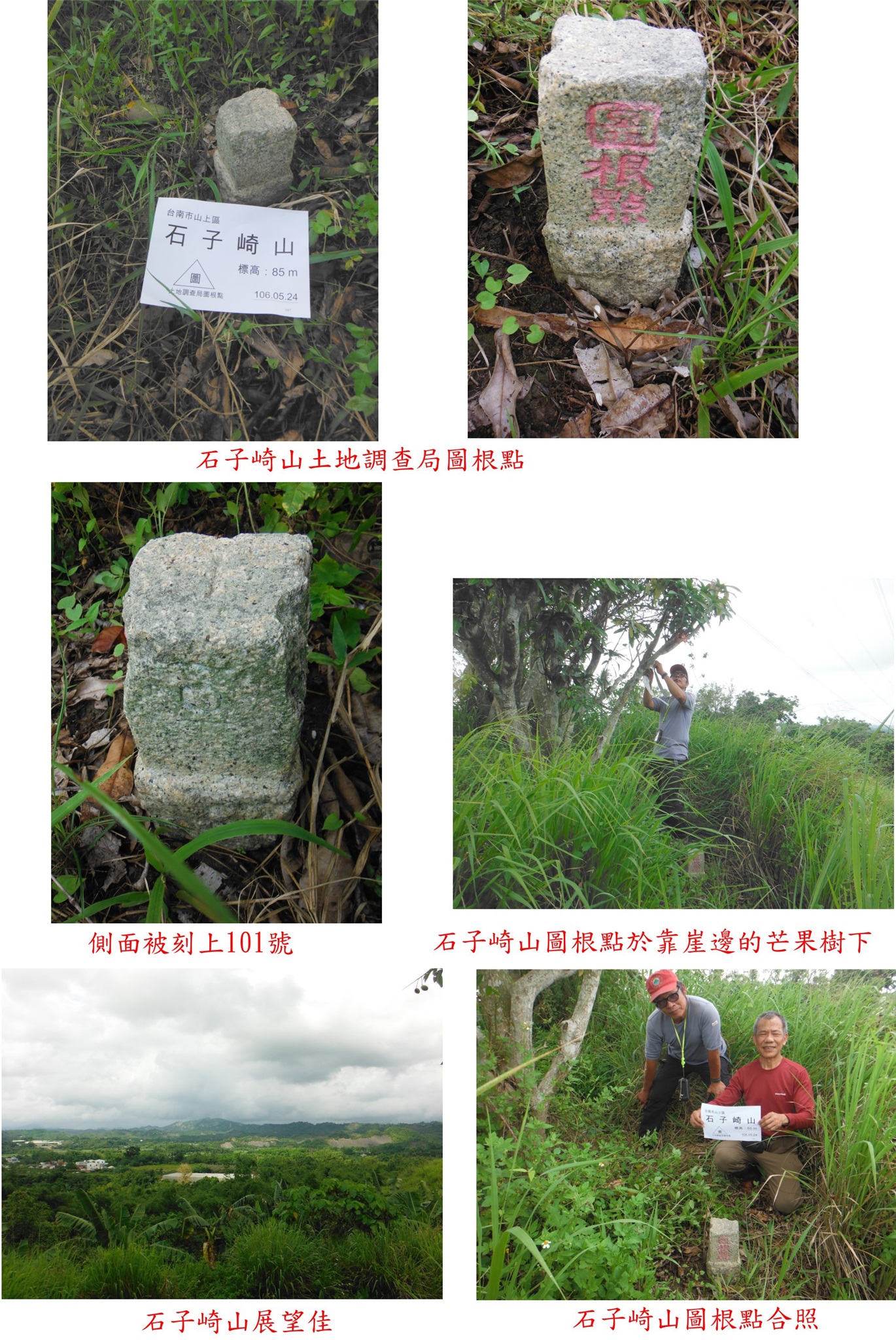 3、石子崎山:位於台南市山上區,標高85公尺,土地調查局圖根點;座標185418 2553761。