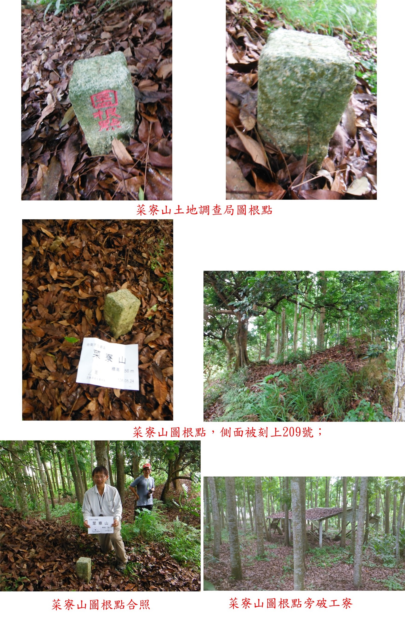 取右入龍眼樹果園再陡上至高點,山頂大平台地種植桃花心木,於靠崖邊處見到菜寮山圖根點,側面被刻上209號;基石旁間破工寮,上山只要5分鐘,回程續走平台地經涼亭、水塔,走階梯路下至私人庭院,再回至停車處,往返費時16分鐘。