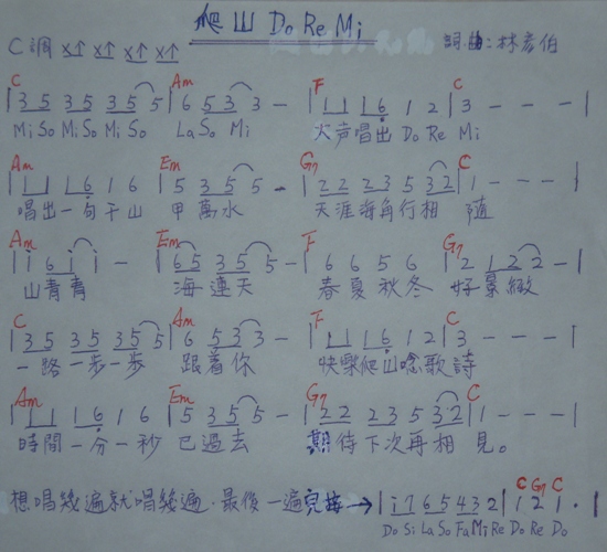 小弟沒有錄音錄影的機絲(玩不起),所以把簡譜貼上來。補給站上臥虎藏龍,有在玩音樂的兄姐,歡迎把歌錄成影音貼到站上來, 好讓山友們傳唱,只要有註明詞曲作者即可。[爬山DO RE MI]完成好一陣子了,現在寫歌都記在腦裏,懶得把譜寫出來,省得哪天又放火燒了,這次為了貼譜才寫譜拍照弄到電腦裏的。