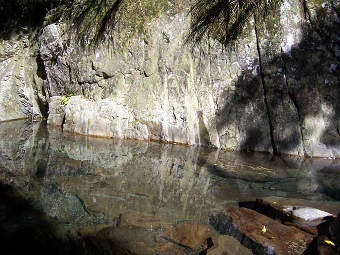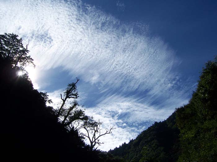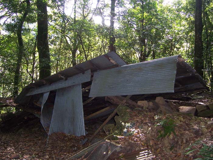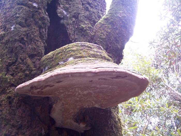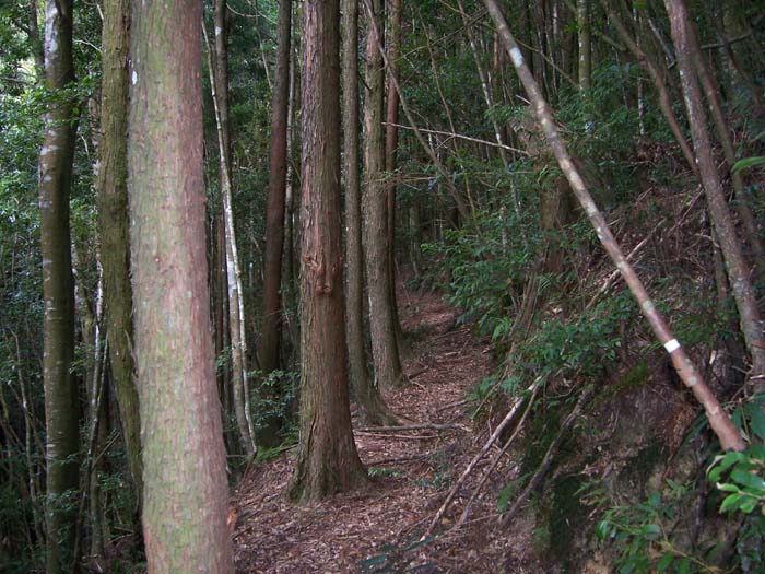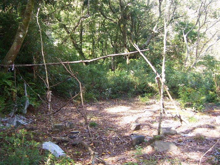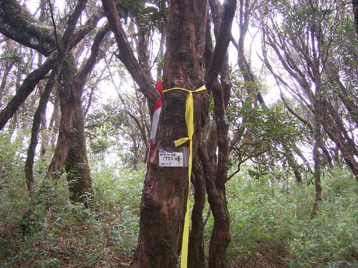 話說從合流營地開始, 首先經Hunter 的營地, 一小段短箭竹後路況就蠻不錯的, 中間有路叉右(但這是回程才發現的), 先沿主要山徑往上, 但後來最後上台車軌道是硬切上的(牛步隊開的路)之後往左, 這裡較為陰濕. 但不用擔心, 就那麼一小段, 硬切的路較濕滑要小心行走. 再來沿台車軌道就一路乾爽漂亮, 讓人享受走古道的樂趣, 直到一小隘口再右稍陡上切(續小隘口往前仍有路不知通那, 莫非可達泰安?), 陡上一段再左行即是一路漂亮的木馬道, 好像百年古道, 現在應沒有多少人走過, 又好像有在維護, 一路好走的世外桃園, 中間會經傾頹的鐵皮工寮, 有一圓形奇怪的灶不知啥用途. 行行復行行, 看最後已過東南峰, 硬切往上達1980峰(5人開會無異議叫它加里山東南南峰), 硬切這一段沒路跡, 但植披稀疏還算好走, 若加些個路標走成路也不錯, 最後攀上 1980峰(原以為是東南峰), 結果找不到森林三角點, 我仍往右切下山坳游過箭竹海再往上另一山頭發現藍天路標, 與其它幾張路標, 鳥山頭一座, 不過這才是加里山東南峰, 但還是沒找到森林三角點. 不過找石頭我興趣沒那麼大罷了, 目標已達, 回東南南峰, 上頭的杜鵑林下空地煮麵泡茶才是好山頭, 隔個山坳, 一邊是天堂, 一邊苦海, 我倒想只走走東南南峰就好.害我小腿肚好久沒傷了, 今天被箭竹射了好幾箭.