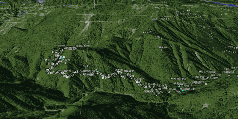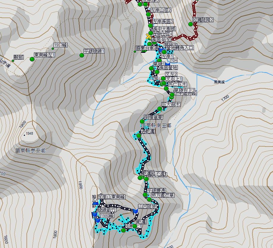 • 地圖放這一格.............................. 加里山東南峰與東南南峰(1980m)間有一小山坳, 這在Garmin上看不到, 最好參考 1/25000 地圖