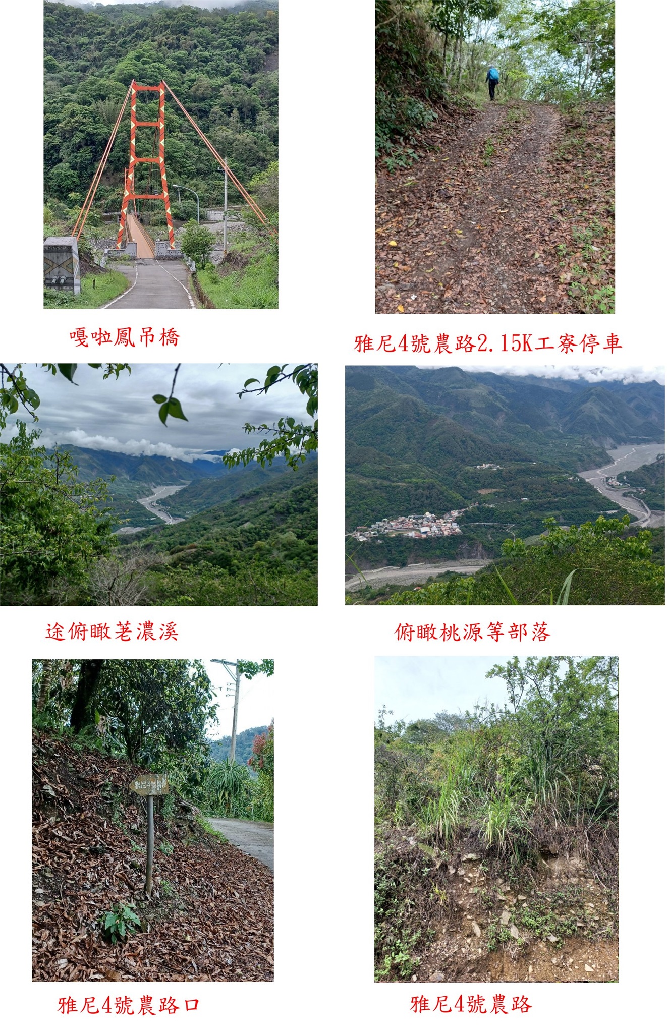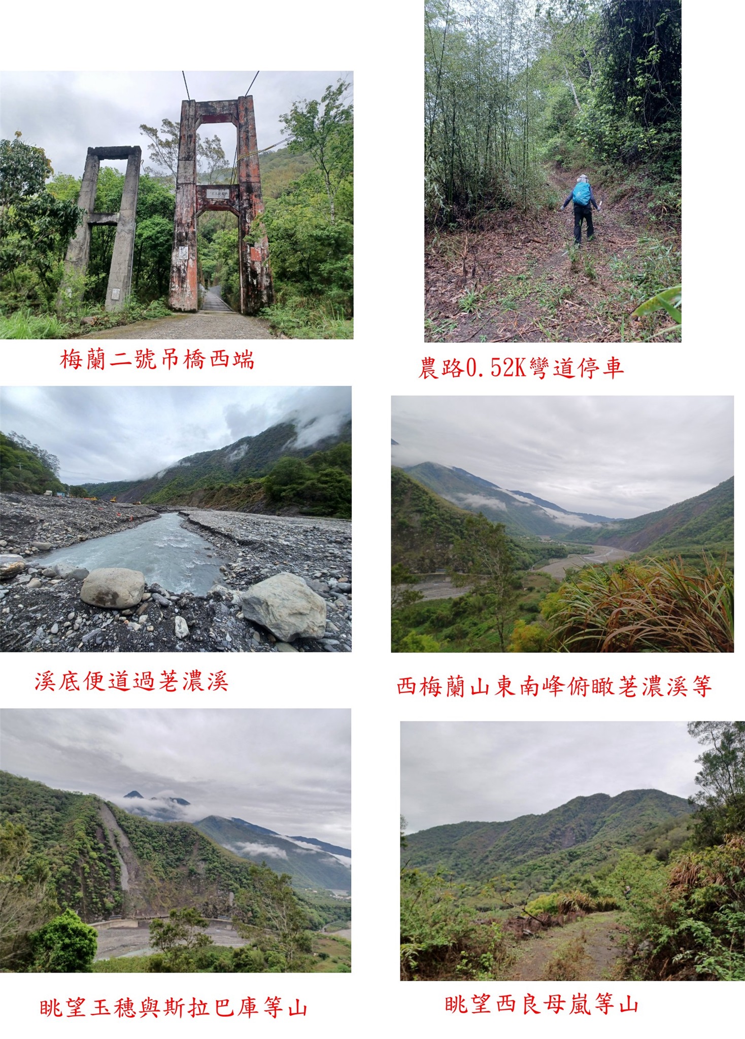 05:45南橫復興部落的民宿出發,台20線(南橫公路)往梅山方向走1.2K叉路【100K處】,左轉溪底便道過荖濃溪走約0.6K梅蘭二號吊橋西端【0K】,右吊橋只能通行機車;取左農路至0.15K叉路,取右行至0.25K轉為碎石路,續行至0.4K叉路,左為農路主線不取,右土石路有圓形大水塔;取右路況差土路,取右土路續走約120公尺。
