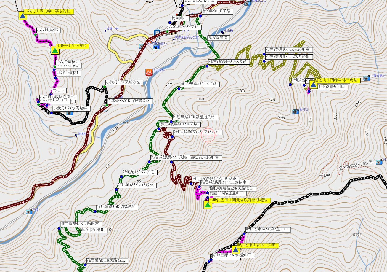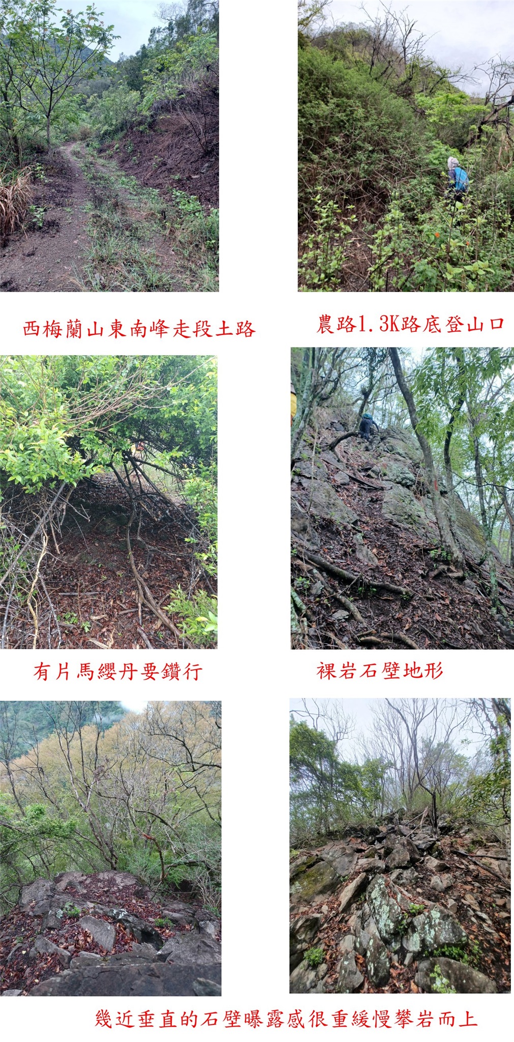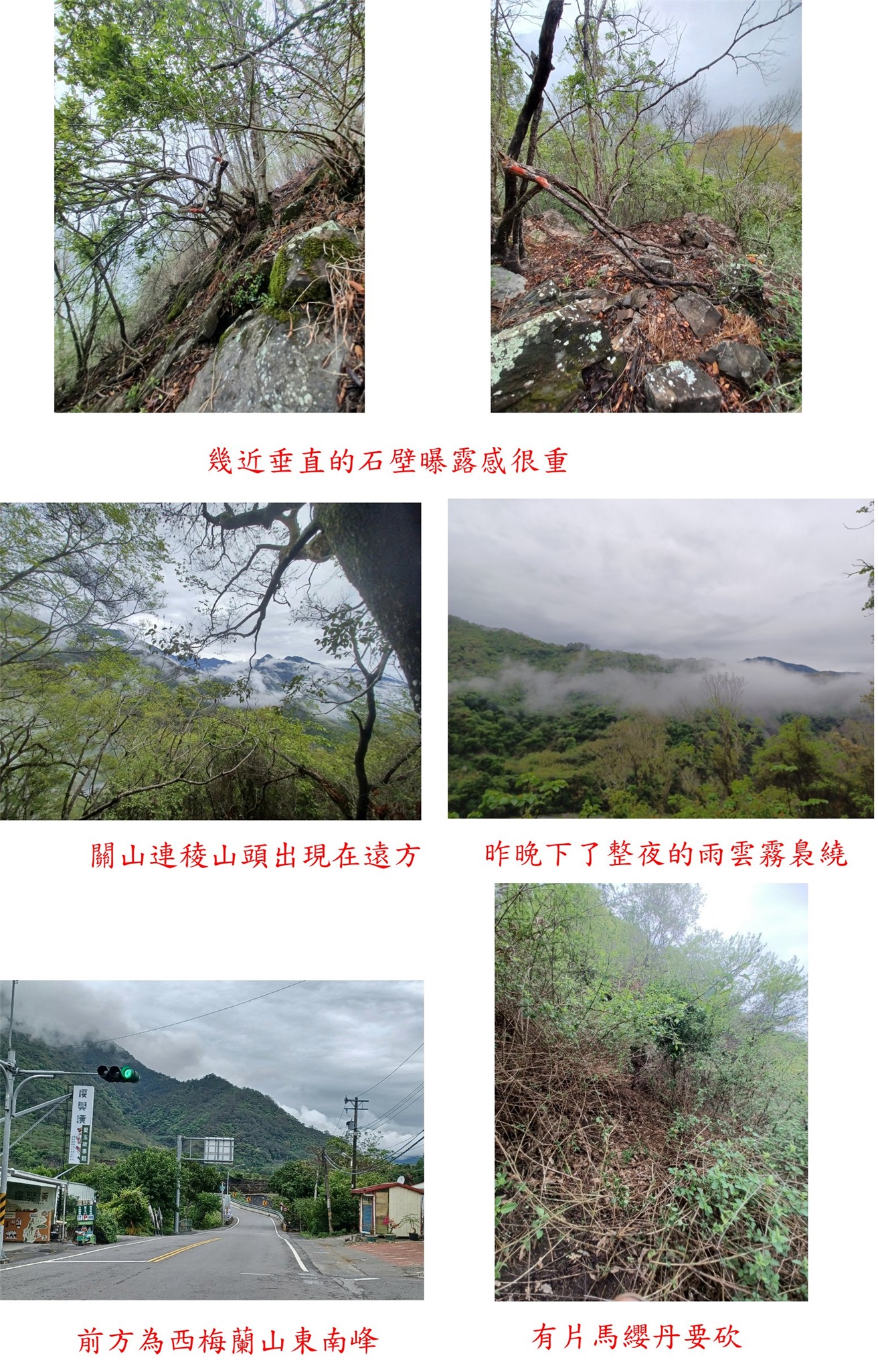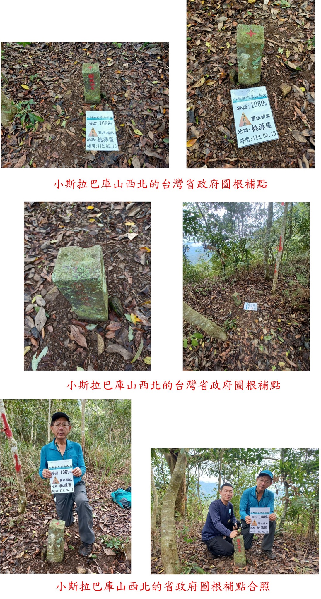 5/13-5/15約山友到高雄登山,本計畫到南橫走幾座較硬斗的中級山,但天氣預報欠佳,改變計劃第三天(5/15)改撿台東阿倫新找到的2顆基石,前晚下了整夜的雨還好清晨雨停了,早上第1座為西梅蘭山東南峰的省政府圖根補點,由台20線100K走溪底便道過荖濃溪至對岸接農路至0.52K停車,走農路至路底1.3K登山口,山徑有夠陡峭,前行有片危險的峭壁地形曝露感很高,於平台地見到基石,上山走50分鐘;第2座為小斯拉巴庫山西北的省政府圖根補點,由由台20線90.1K左下過嘎啦鳳吊橋走雅尼農路上山至1.9K叉路,左轉雅尼4號農路至2.15K工寮停車,走土路至梅園路底2.7K登山口,取左順稜行走約80公尺即見到基石,上山只要19分鐘。