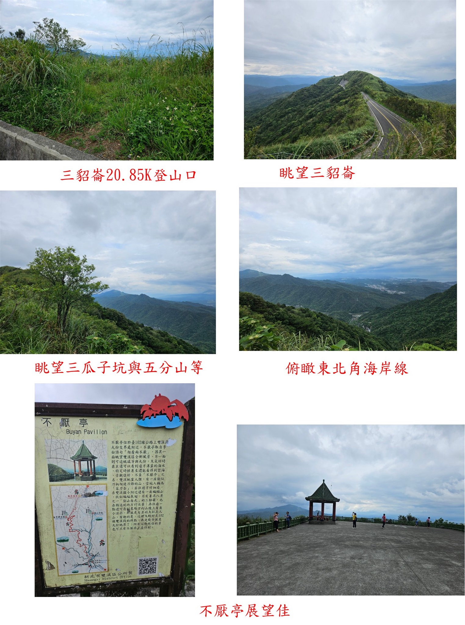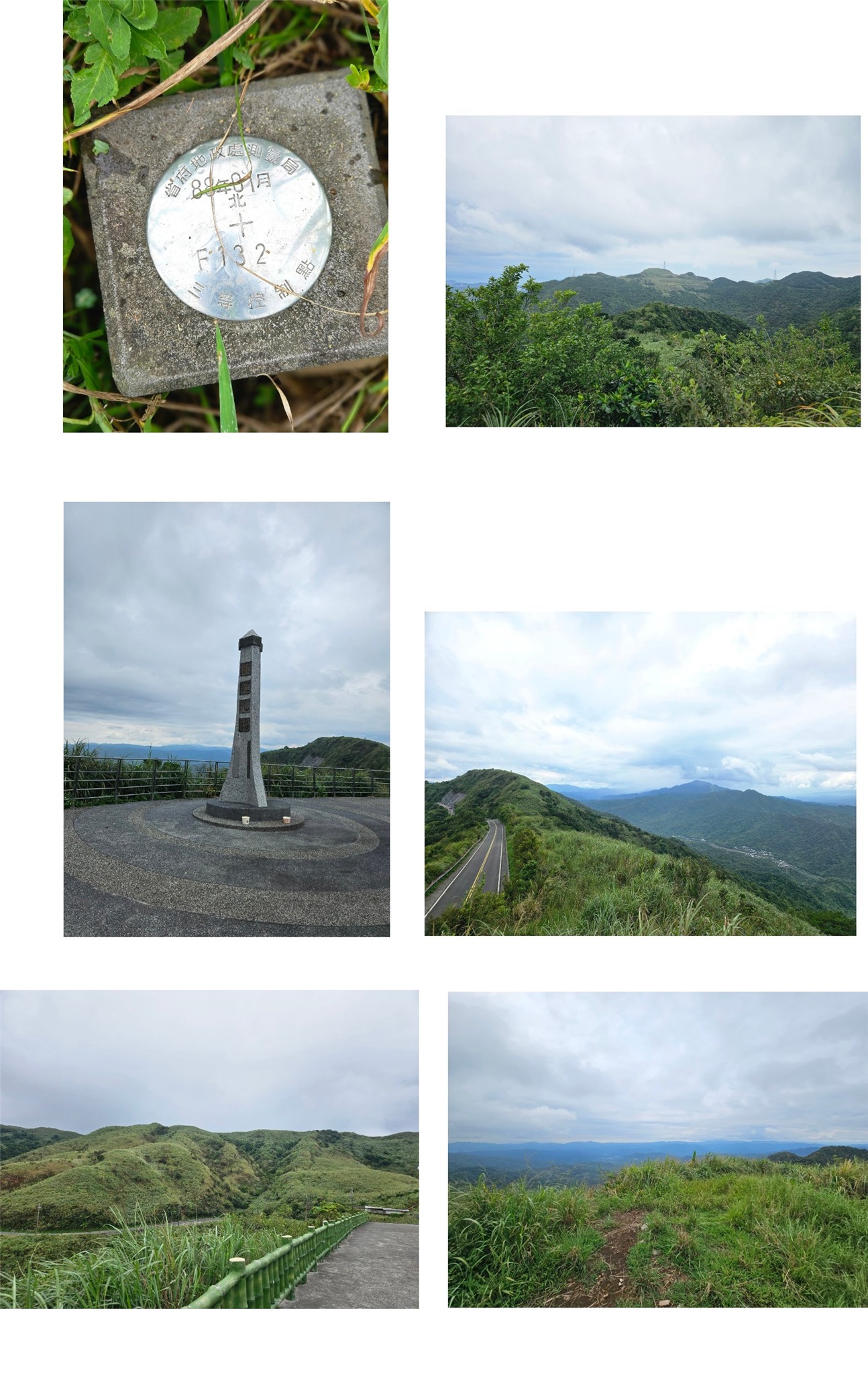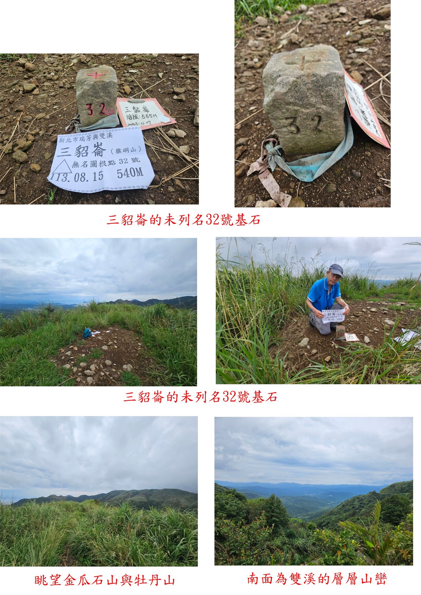 取右矮駁坎隨即為稜線,右往不厭亭;取左往三貂崙,山徑平緩路徑尚明,稜線無樹林很曬,很悶無風滿身大汗,走12分鐘抵小山頭,即見到三貂崙的未列名32號基石;山徑續行通往三貂嶺大崙3-1076,此點前漏掉來補;山頂有全方位的視野,西面眺望三爪子坑山與五分山連稜,南面為雙溪的層層山巒,往返費時29分鐘;到附近的不厭亭賞景,欄杆外有顆地政處F132三等控制點。