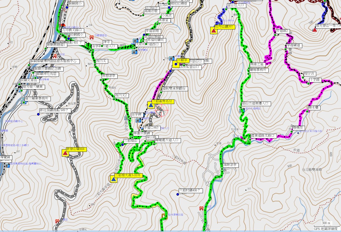 08:14大粗坑古道叉路,右線為小粗坑古道、亦有步道出九份老街;水泥路續走220公尺。