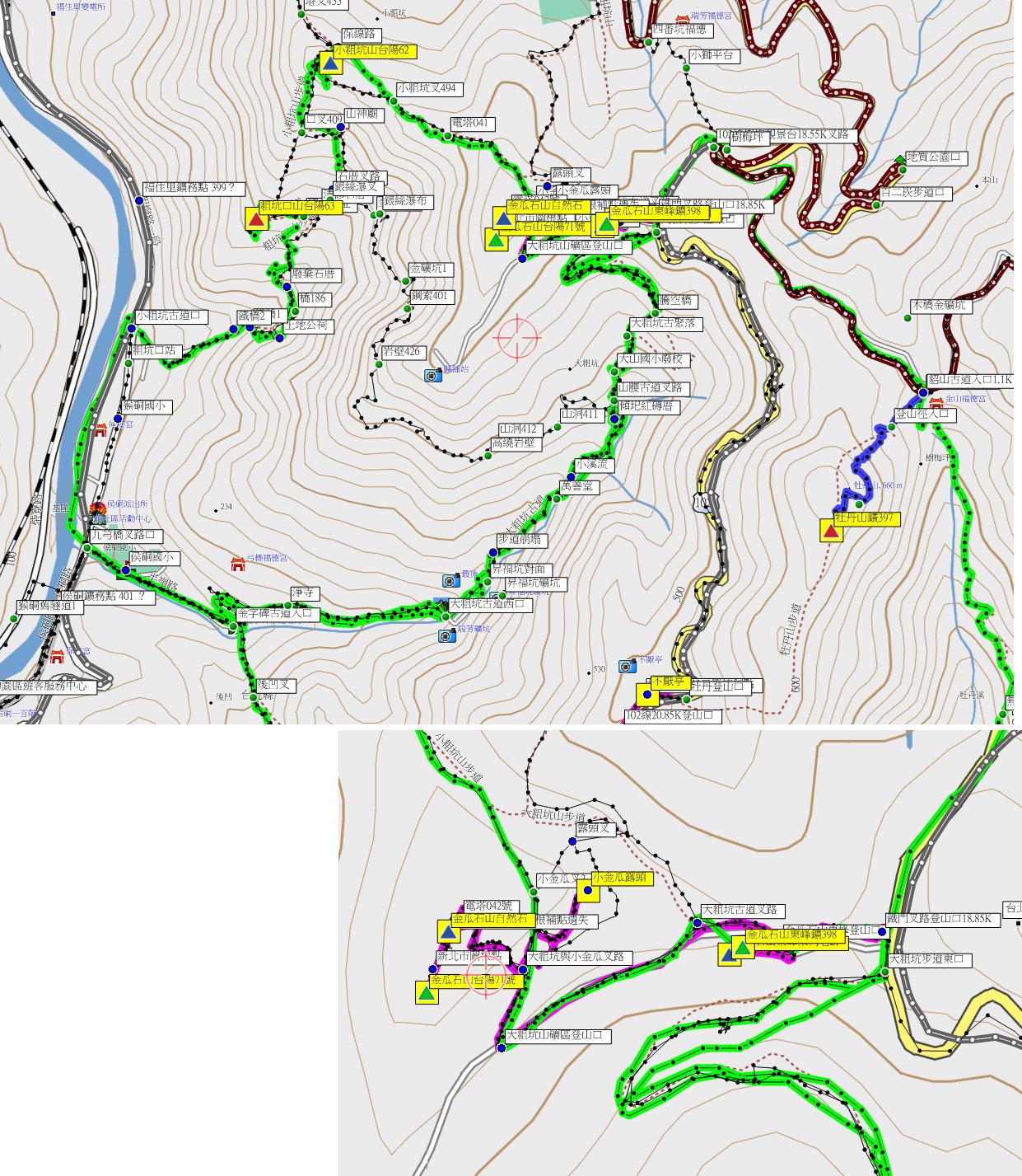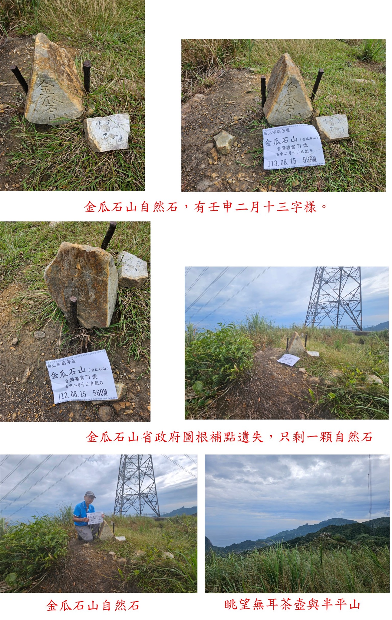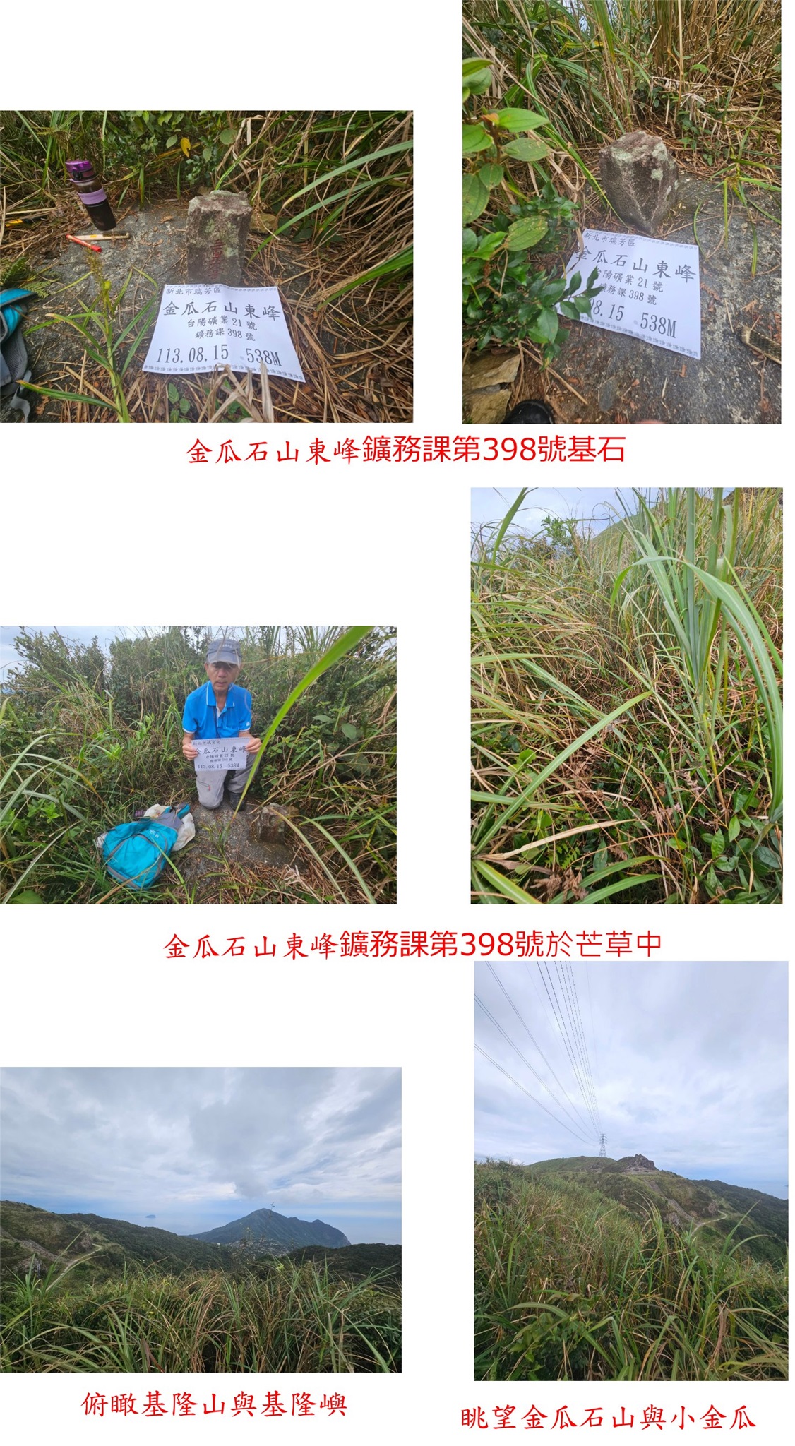 這幾天比對大台北地區是否有遺漏的基石,發現漏掉金瓜石山的台陽礦業71號,8/15去補並順撿東峰鑛398等2顆曾去過的基石;車停102線18.85K鐵門叉路,走12分鐘抵達大粗坑山(金瓜石山),小粗坑與大粗坑古道曾走過數次,以前來時有顆省政府圖根補點但不知為何遺失?以一顆自然石代替,相距