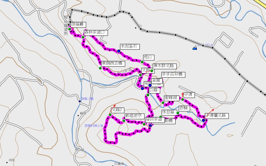 頂福巖森林步道原全長3450公尺,現於天搖地動橋左上方又增闢一段步道,此行優閒漫步,繞一圈全程時間約2小時餘。