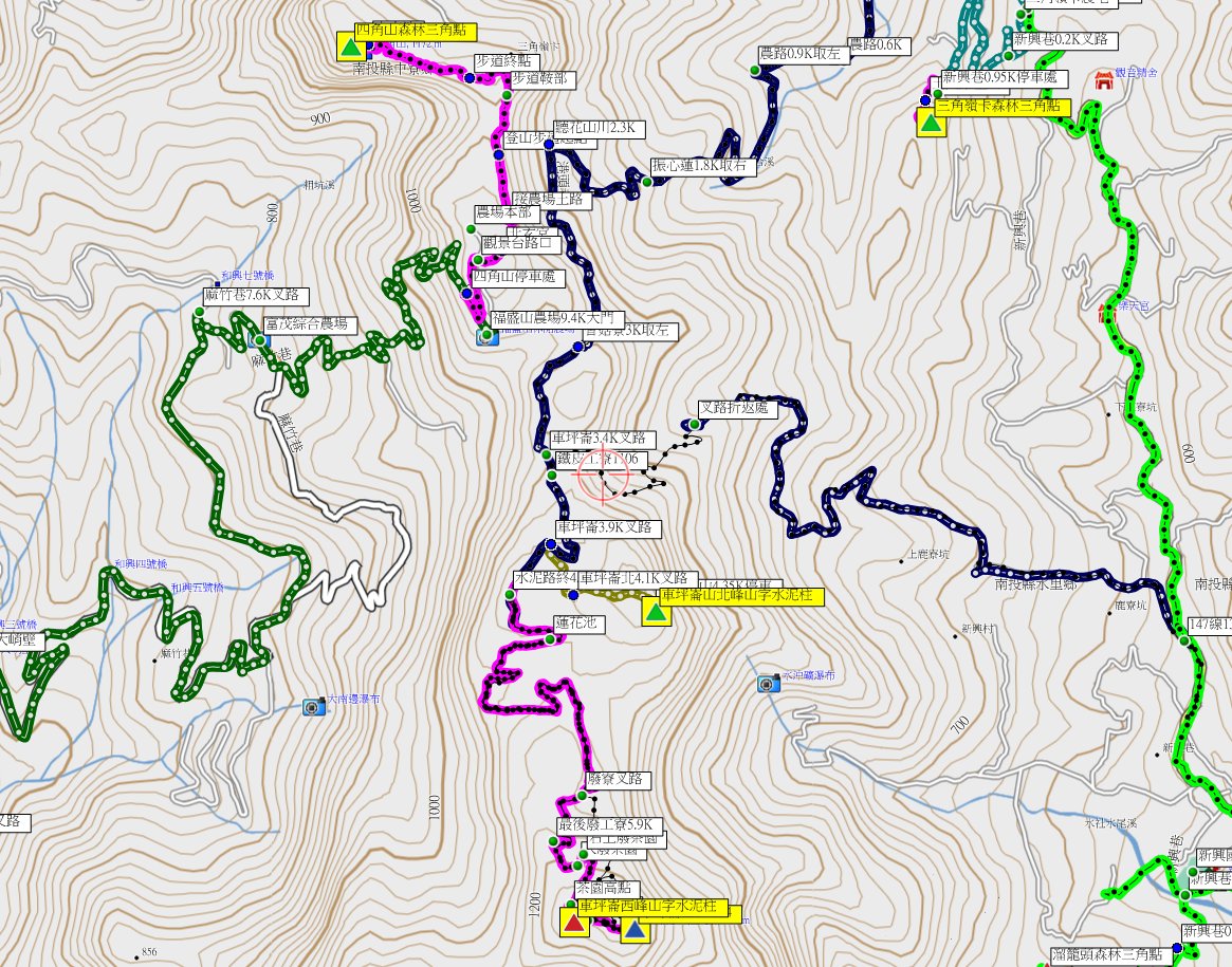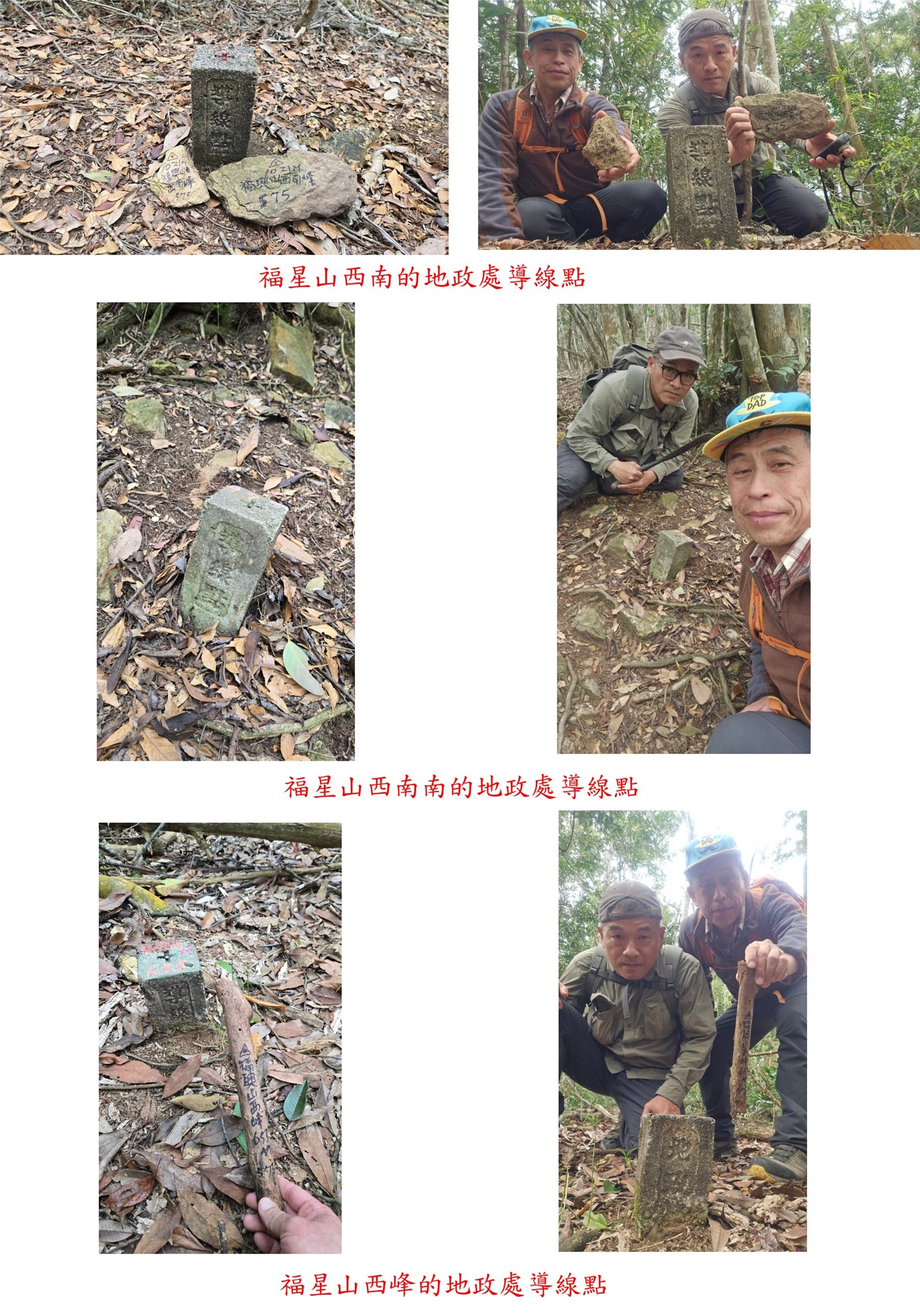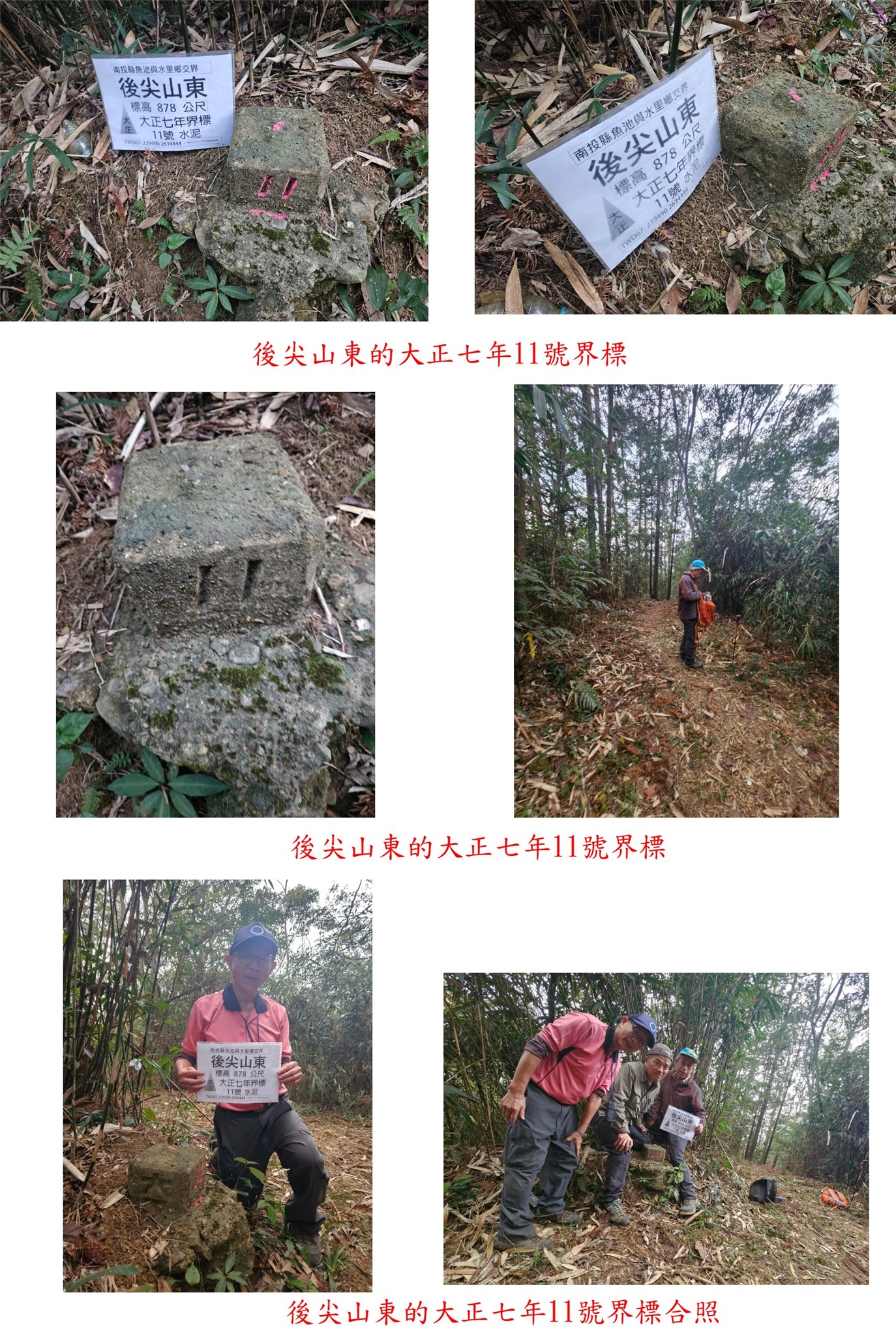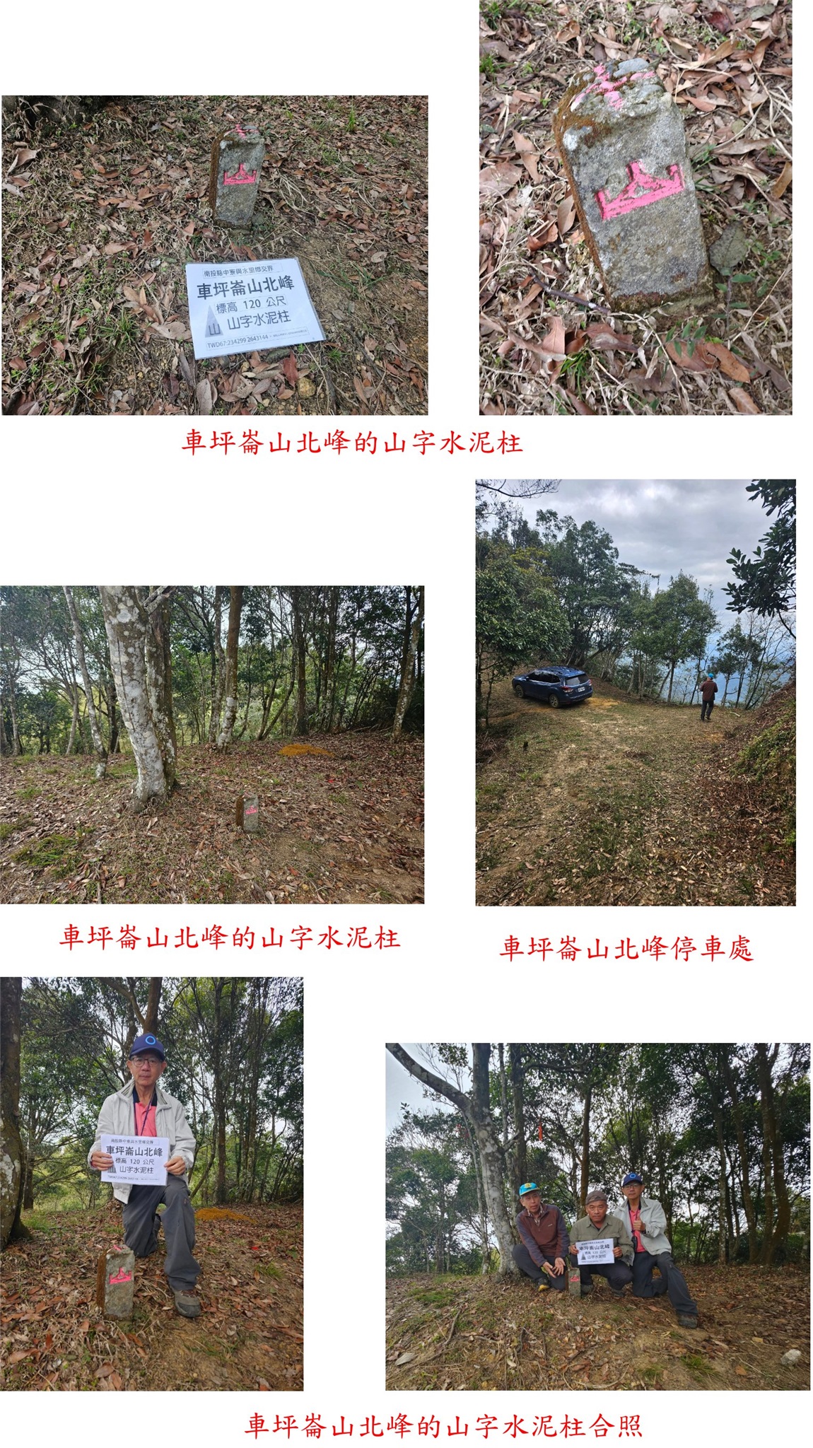 梅子崎山、福興山、車坪崙山北峰與後尖山東-南投基石巡禮篇2/24先到台中地區補2顆新找到的基石,再來前往南投補4顆新找到或遺漏的基石;第1顆為梅子崎山的山字水泥柱,位於埔里大坪頂山區,補佐(A)森林點實際上為山字水泥柱,往返費時1小時又14分鐘;第2顆為福興山的省政府圖根補點,車停稜線上的慶安宮,前段為石階步道,後段為路況佳的杉木林山徑,走46分鐘抵達基石,去年剛來過當時無基石,勇伯又找到省政府圖根補點再訪;第3顆為車坪崙山北峰的山字水泥柱,由147線9.6K叉路轉農路走4.35K路底前停車,走30餘公尺即抵達基石,車可直達輕鬆入袋;第4顆為後尖山東的大正七年11號界標,正路應走後尖山步道上山,勇伯帶領走另一檳榔園農路上稜,上山走28分鐘。