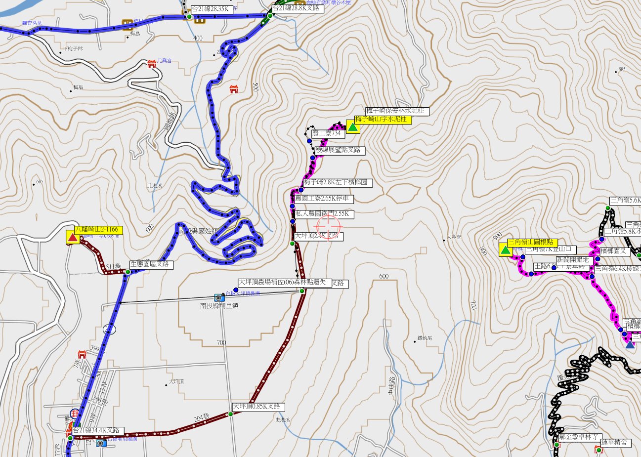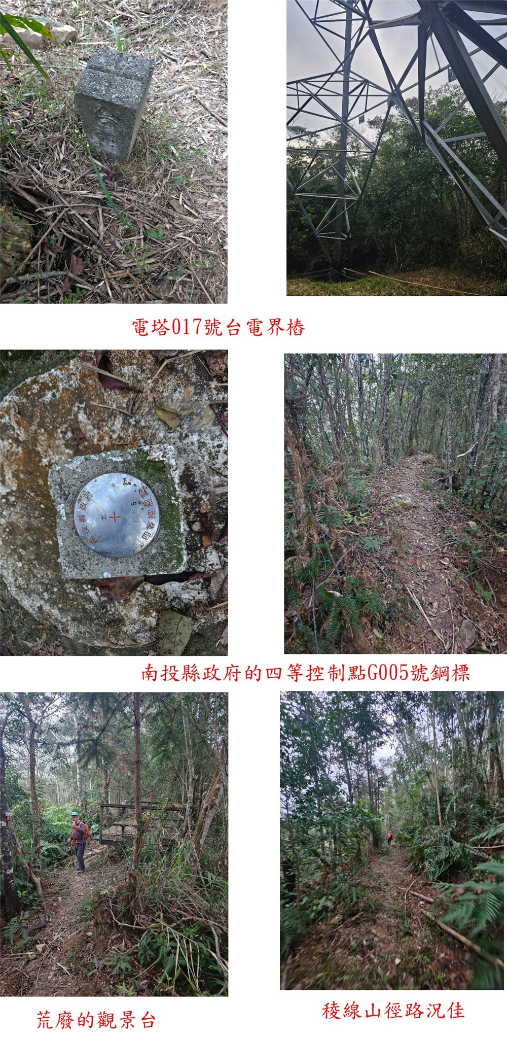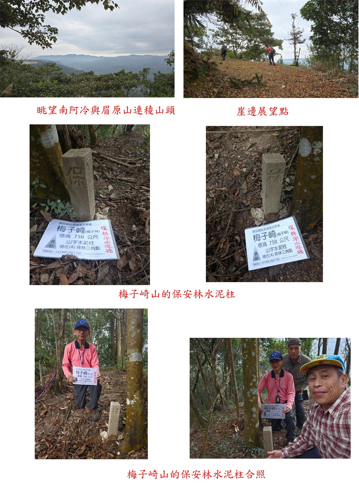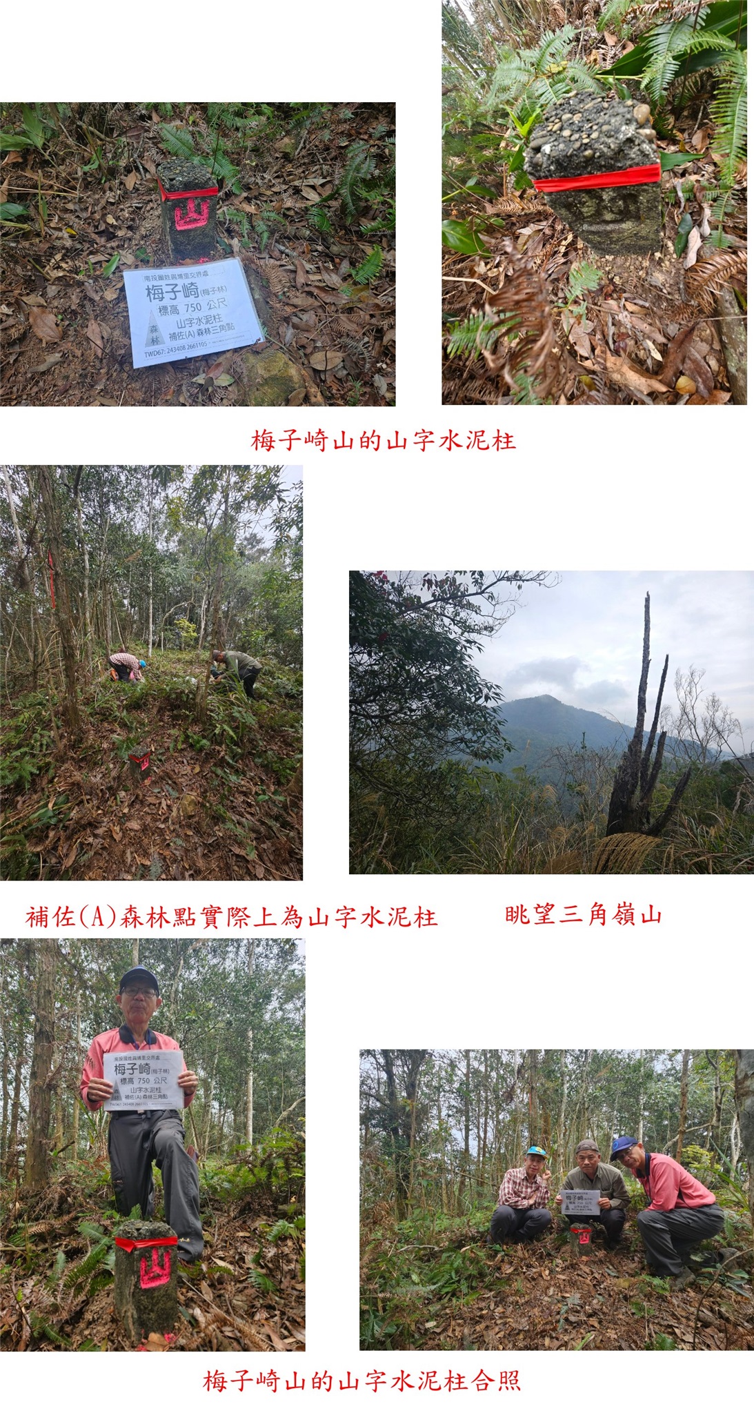 梅子崎山、福興山、車坪崙山北峰與後尖山東-南投基石巡禮篇2/24先到台中地區補2顆新找到的基石,再來前往南投補4顆新找到或遺漏的基石;第1顆為梅子崎山的山字水泥柱,位於埔里大坪頂山區,補佐(A)森林點實際上為山字水泥柱,往返費時1小時又14分鐘;第2顆為福興山的省政府圖根補點,車停稜線上的慶安宮,前段為石階步道,後段為路況佳的杉木林山徑,走46分鐘抵達基石,去年剛來過當時無基石,勇伯又找到省政府圖根補點再訪;第3顆為車坪崙山北峰的山字水泥柱,由147線9.6K叉路轉農路走4.35K路底前停車,走30餘公尺即抵達基石,車可直達輕鬆入袋;第4顆為後尖山東的大正七年11號界標,正路應走後尖山步道上山,勇伯帶領走另一檳榔園農路上稜,上山走28分鐘。