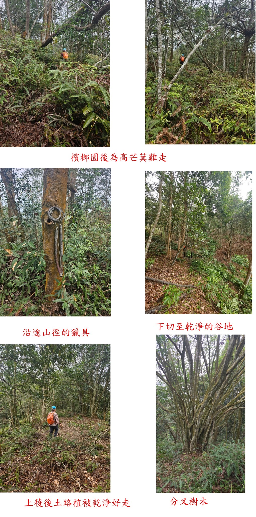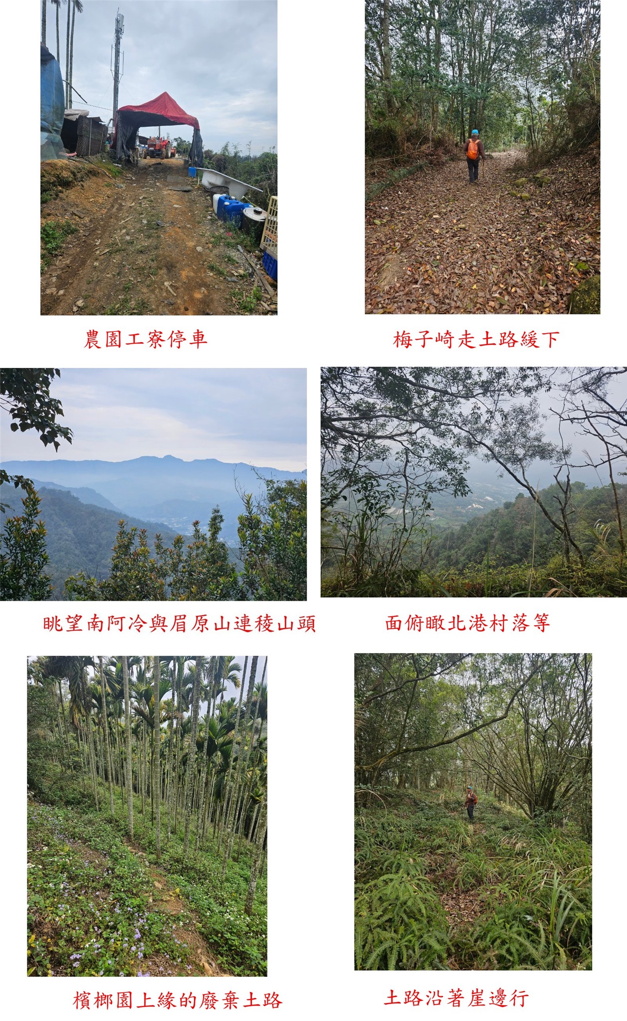 農園為溫室棚架,土路緩下走0.15K叉路(2.8K處),北面眺望南阿冷與眉原刀山連稜山頭,取左小徑進入檳榔園上緣的廢棄土路,土路沿著崖邊行過檳榔園後為高芒萁難走,幸好山友有砍出一條依稀的小徑,土路走