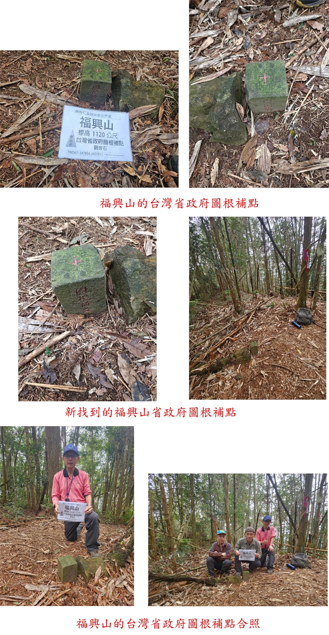 13:38△福興山,高1120公尺,省政府圖根補點,於路右很明顯卻沒山友見到,去年勇伯路過發現,再來一次補漏,感謝勇伯陪我再來一次,上山走46分鐘;路右西南稜路線可出能高親水公園,勇伯與小楊走此路線下,途中有3顆地政處導線點。