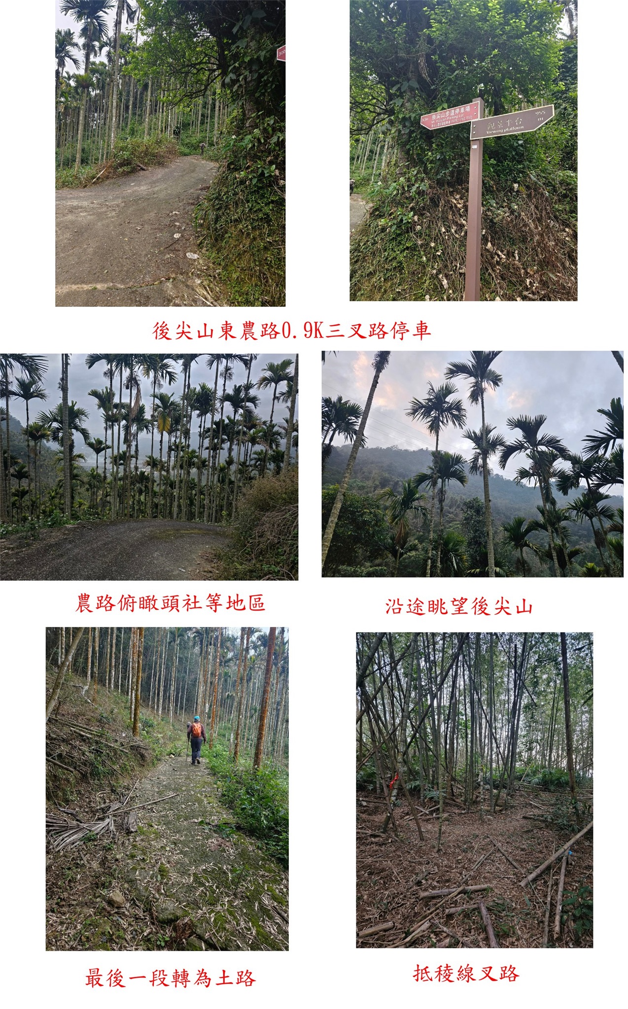 勇伯帶我們走另一捷徑上山,取左荒涼的檳榔園水泥農路一路陡上,走0.55K三叉路,取右續行最後一段轉為土路,續走0.15K抵稜線叉路,右順稜往後尖山3-5009;取左順稜行隨即經017號電塔,稜線山徑走