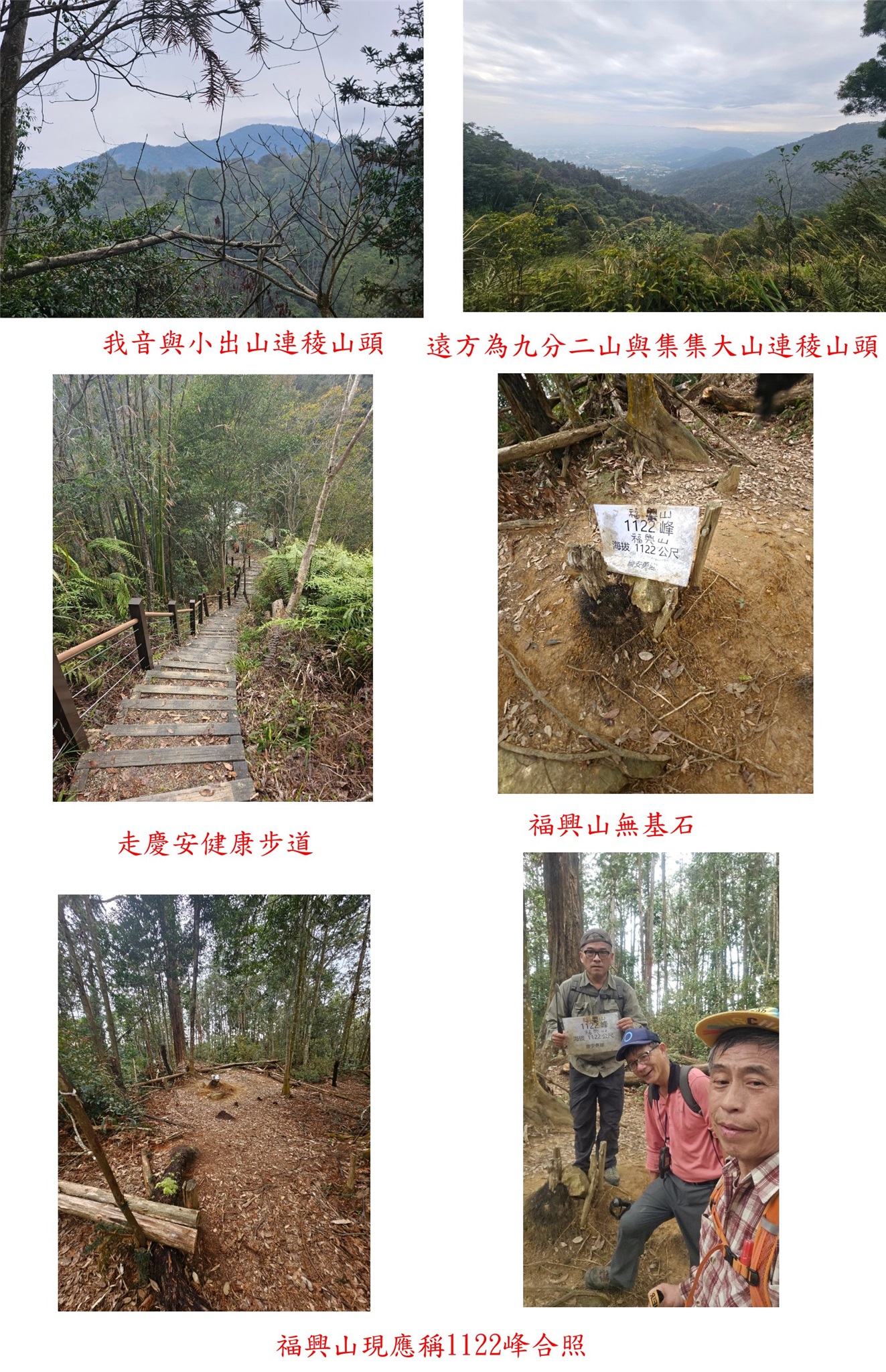 13:37△福興山,高1120公尺,無基石,發現基石後現在應稱1122峰,但有塊三角型石塊標示福興山,去年剛來過;有登頂牌,山頂於杉木林內無展望,上山走45分鐘,山徑續走30餘公尺。