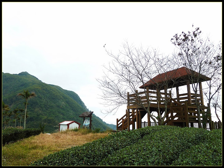 涼亭在山頂上,前有茶園、旁有大尖山的陪伴。