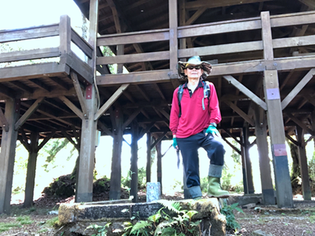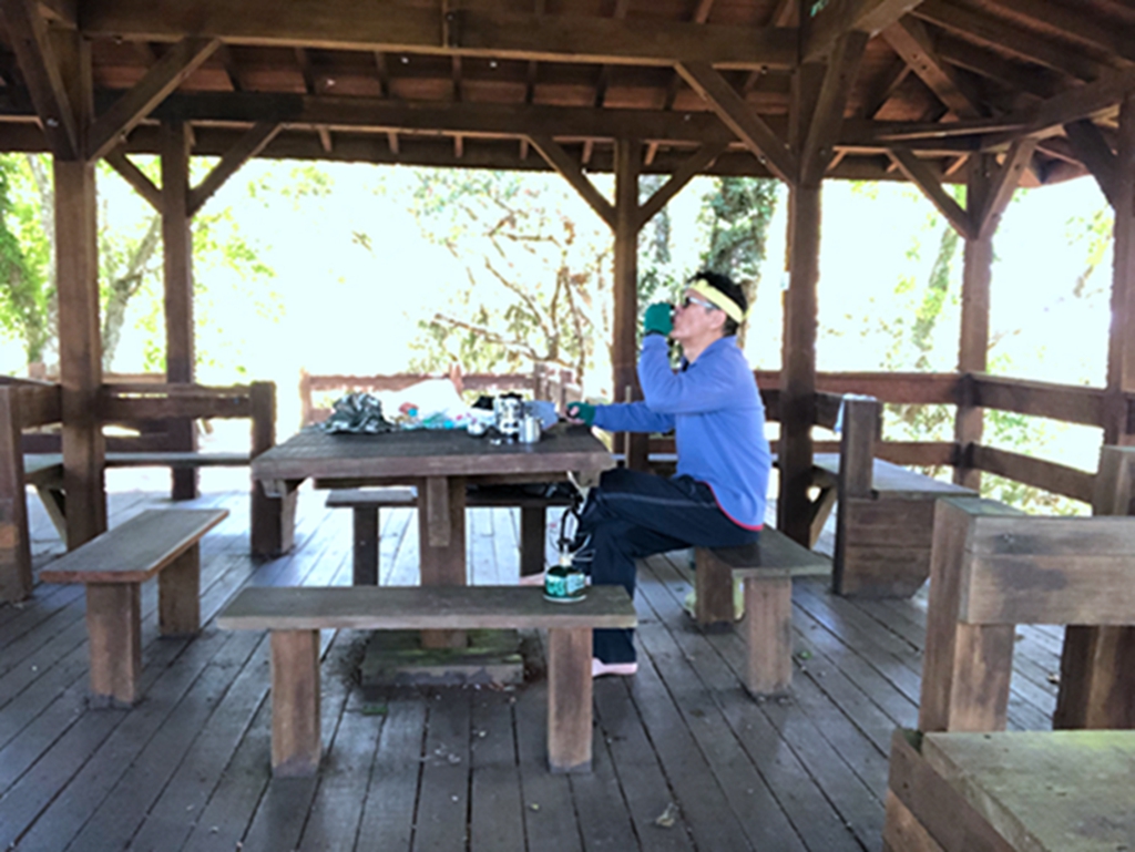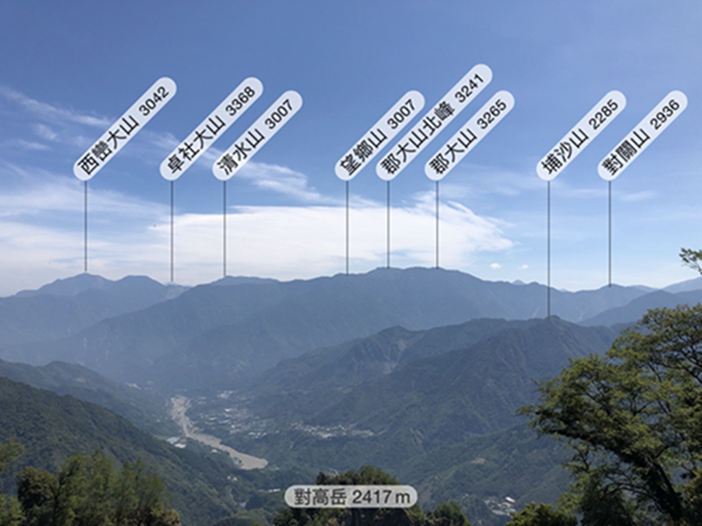 10:10~12:10對高亭(028),H 2440 m,木造二樓對高亭,亭下右側有一基石,即是對高岳,阿里山林補39號;前面山徑上展望佳,往下俯瞰和社溪旁的神木村,往上遠眺西巒大山、卓社大山、清水山及郡大山一字排開,歷歷在目;時間還早,美景當前,不免要放開心胸泡茶糜爛,順把剛照的照片丟臉書,邊泡茶邊喇賽,泡茶加午休一晃2小時。