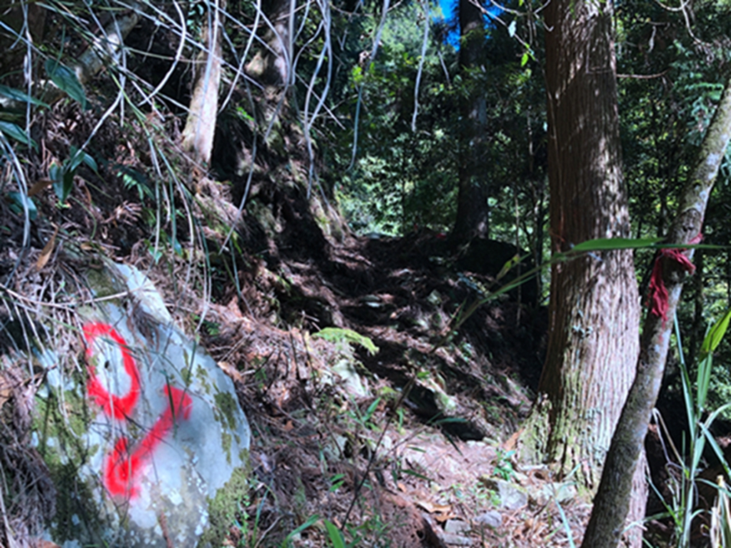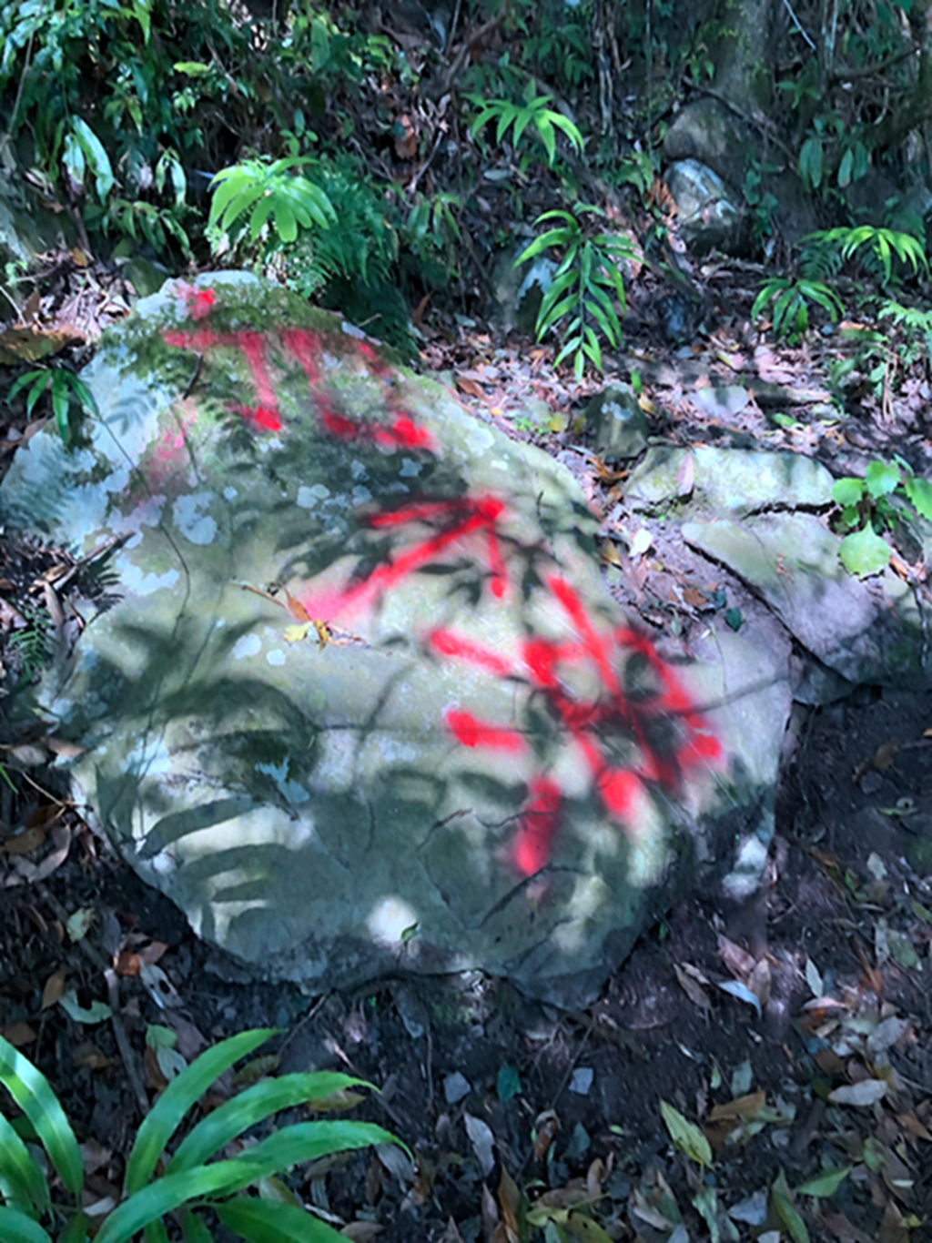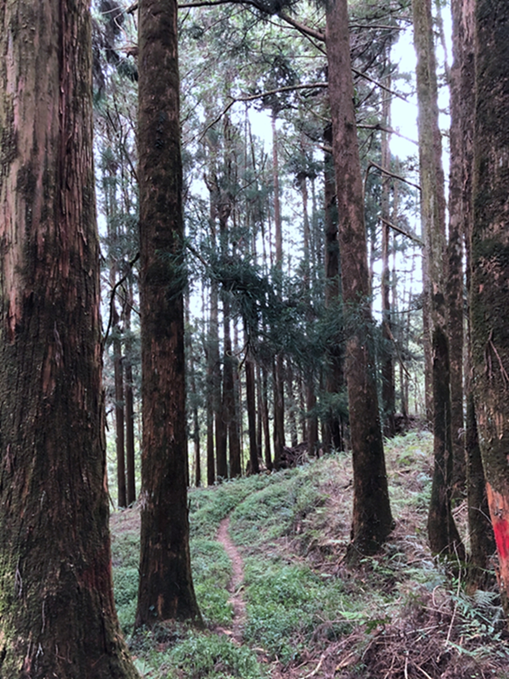 08:36古道O記(018),H2116 m,路旁石頭有紅漆噴上O記及雙箭頭,不知是何用意?從這裡之後路愈走愈寬,之字形向上,頗有十八彎的味道,兩旁全是高壯的杉木林,沿途林相豐富境朗林幽,不知不覺放慢腳步,浸淫在濃郁的芬多精之中。
