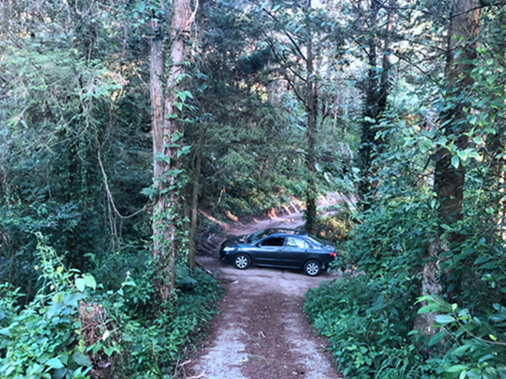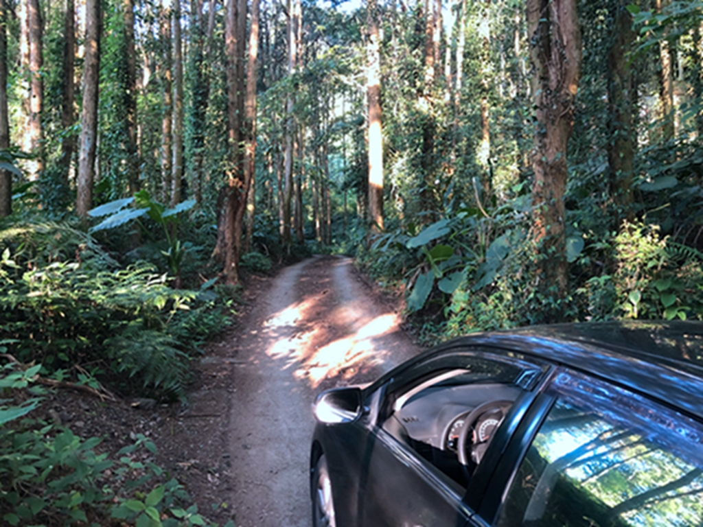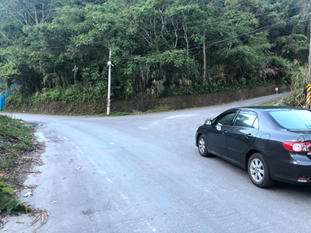 05:42神阿縱走岔路(003),H1148 m,由神木國小開回約700公尺,有一岔路取左直上往登山口,往登山口車程約3.2K,都是水泥產業道路很好開,兩旁盡是杉木林與竹林,但路面狹小會車不易,有幾處髮夾彎轉彎時要小心。