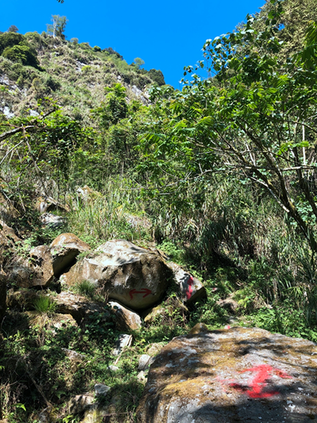 07:59接乾溪溝(014),H1956 m,這一段山徑較陡峭難行,幾次跨越乾溪谷,幸好天氣晴朗沒下雨,溪谷疊石並不濕滑;溪谷大石頭都有標示方向,唯山徑旁咬人貓遍佈,行走要小心,還好今天有穿長筒雨鞋,有備而來。