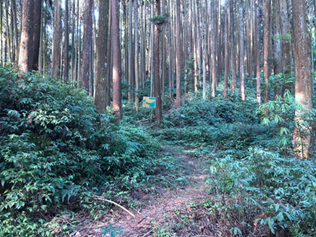 06:38四岔路登山口(006),H1565 m,車子停在前面路旁整裝後回來四岔路登山口起登,周遭環境約略巡禮一番,左岔上去是茶農工寮,右岔有巨型水塔,登山口已綁有哇哈哈布條很好辨識,一進入山徑兩旁盡是清幽的人造杉木林。