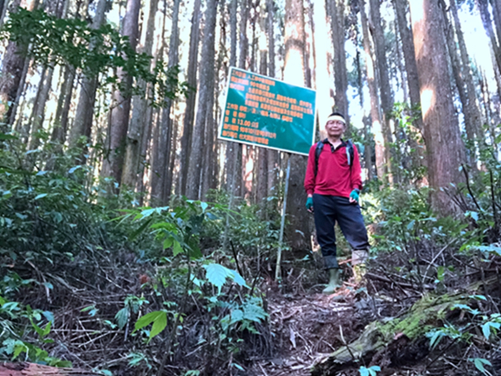 06:55告示牌(007),H1657 m,林道旁有一綠色告示牌,為台大實驗林管理處所立,共13公頃的人造杉木林,目標是平衡森林生態永續經營;這一大片茂密的杉木林,樹幹通直高聳入雲,猶如走進黑森林裡,令人心曠神怡。