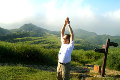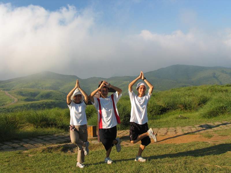 1400:玉皇宮,休息。大家禮貌的向執事打個招呼,於廟偏僻處席地而坐,泡茶,吃水果。雖然天氣熱,大家心情都很好,於是開始秀功夫、瑜珈、冷笑話。我起個頭,秀我的養生氣功與雙盤,然後美女就秀起瑜珈,什麼蛇式、貓式、狗式,不外就是要保持身體柔軟,身體健康。