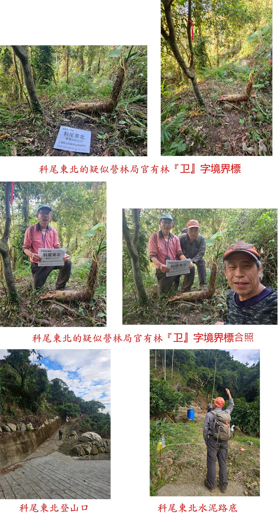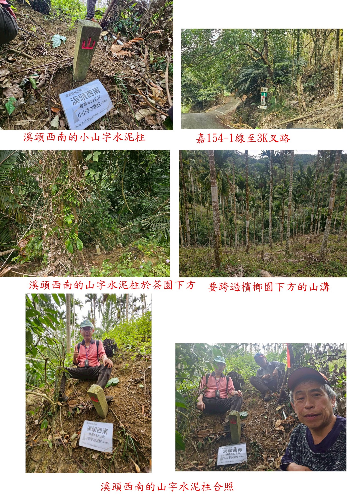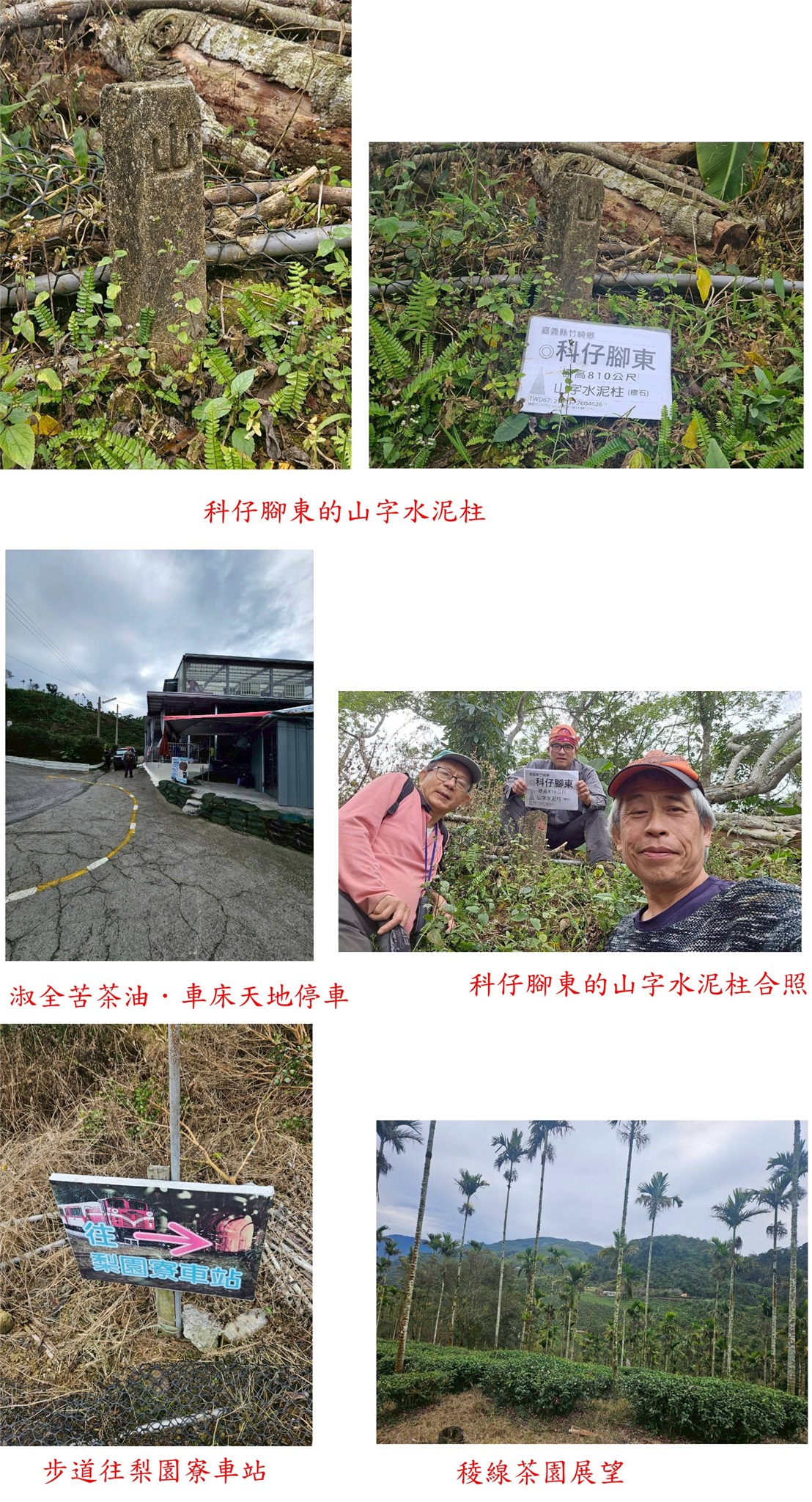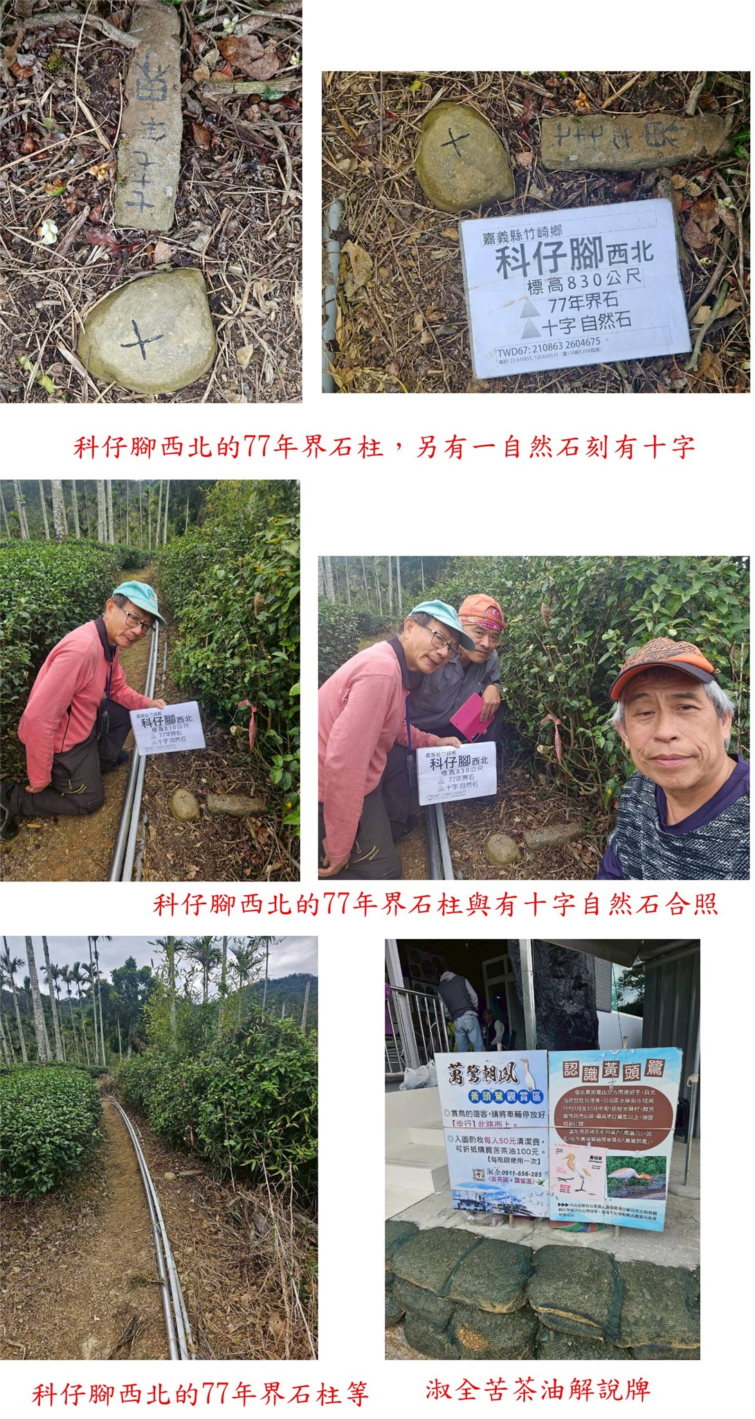 溪頭西南、太興國小東、溪頭東南、科仔腳東、科仔腳西北、科尾東北與竹崎-嘉義基石巡禮篇day2-212/27-12/28約山友到竹崎與梅山等山區,尋訪7777山友新找到的基石,第二天(12/28)下午行程,第1顆為溪頭西南的山字水泥柱,走茶園農路上山7分鐘即可抵達,但因點位稍有偏差,找了25分鐘方尋獲;第2顆為太興國小東的山字水泥柱,基石於檳榔園斜坡上,上山走11分鐘;第3顆為溪頭東南的山字水泥柱,走對路線只要5分鐘即可入袋。第4顆為科仔腳東的山字水泥柱,於車床天地上方茶園步道旁,此點再訪;第5顆為科仔腳西北的77年界石柱、另有一自然石刻有十字,於往梨園寮車站步道旁;第6顆為科尾東北疑似斷頭的卫石,此點於阿拔泉稜線西邊的山麓,由科尾農路路底前上切,前段為開墾地,後段要自行砍路難走,走了近1小時方抵達,基石於廢棄檳榔園內,找了35分鐘方尋獲斷頭的卫石,此點有些難度;第7顆順路去尋訪竹崎的控制點Q254號,於竹崎親水公園內。