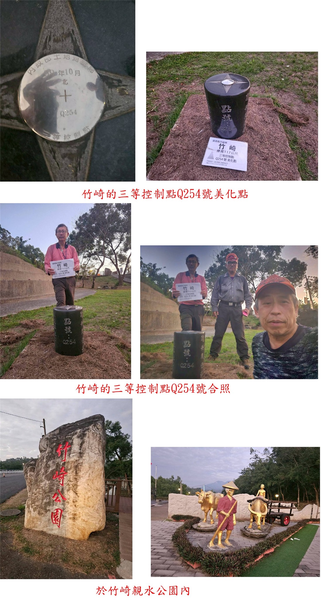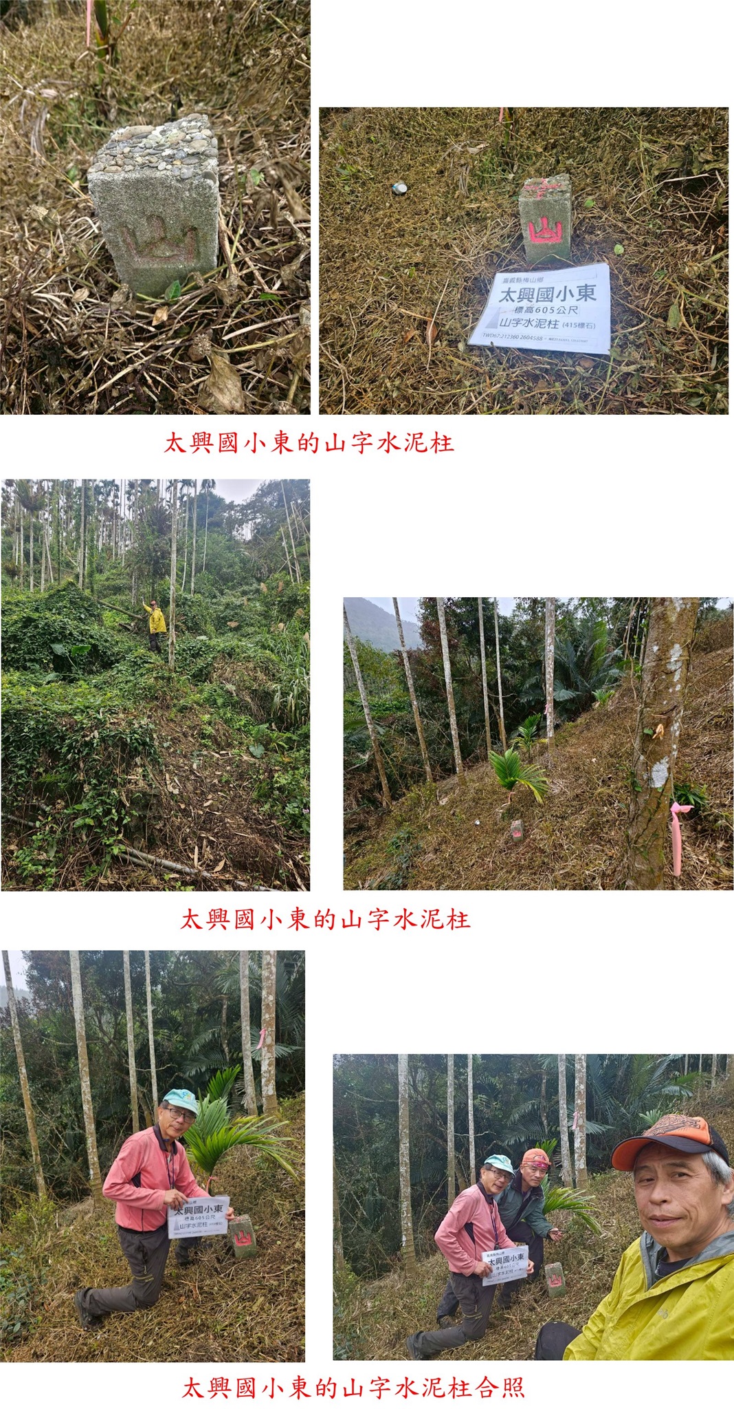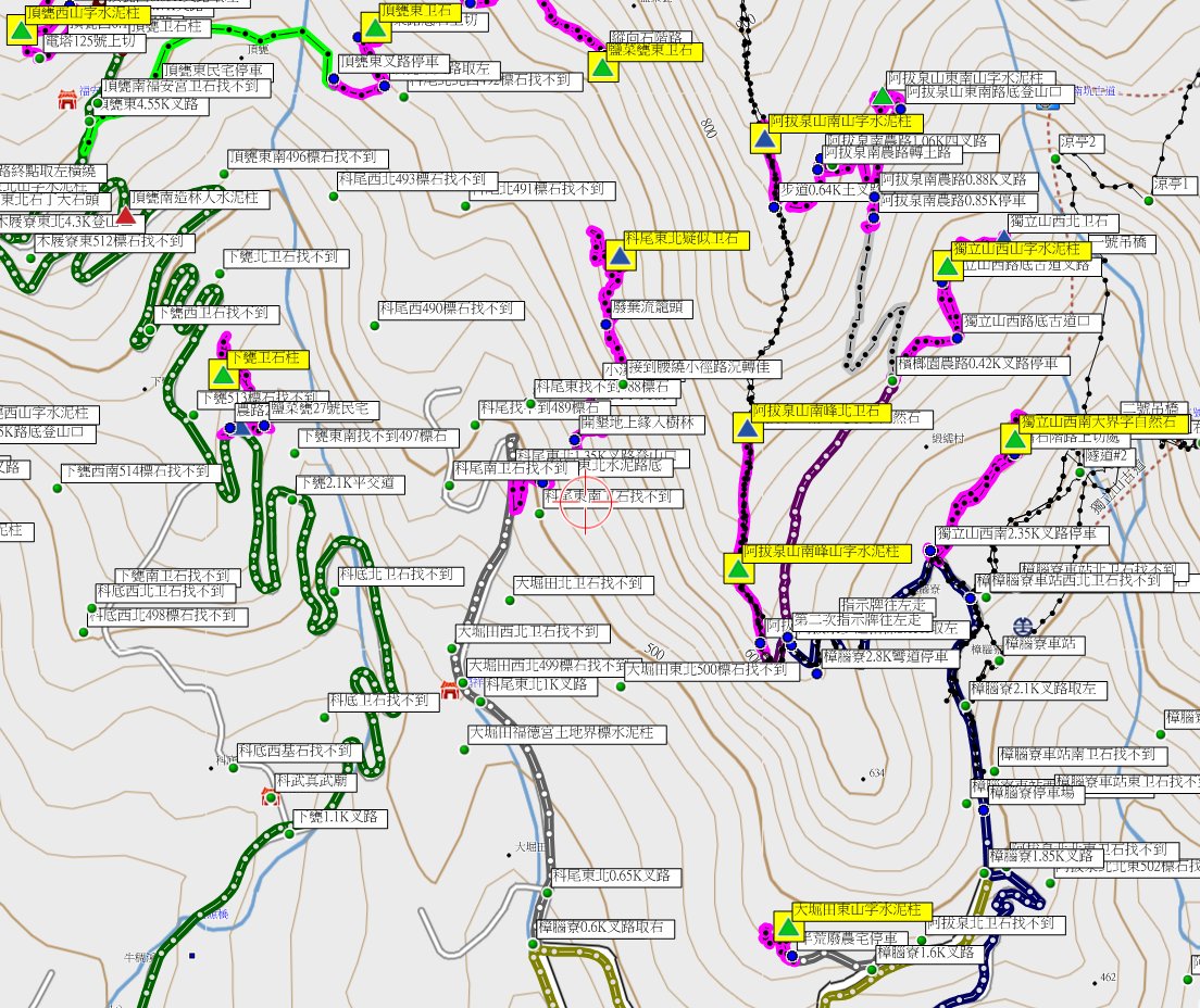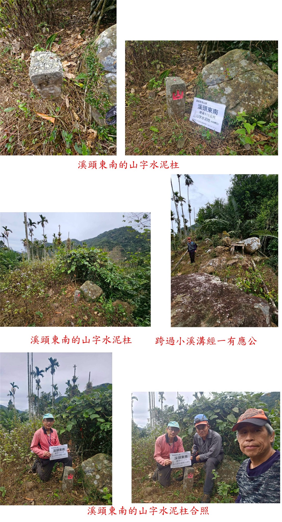 溪頭西南、太興國小東、溪頭東南、科仔腳東、科仔腳西北、科尾東北與竹崎-嘉義基石巡禮篇day2-212/27-12/28約山友到竹崎與梅山等山區,尋訪7777山友新找到的基石,第二天(12/28)下午行程,第1顆為溪頭西南的山字水泥柱,走茶園農路上山7分鐘即可抵達,但因點位稍有偏差,找了25分鐘方尋獲;第2顆為太興國小東的山字水泥柱,基石於檳榔園斜坡上,上山走11分鐘;第3顆為溪頭東南的山字水泥柱,走對路線只要5分鐘即可入袋。第4顆為科仔腳東的山字水泥柱,於車床天地上方茶園步道旁,此點再訪;第5顆為科仔腳西北的77年界石柱、另有一自然石刻有十字,於往梨園寮車站步道旁;第6顆為科尾東北疑似斷頭的卫石,此點於阿拔泉稜線西邊的山麓,由科尾農路路底前上切,前段為開墾地,後段要自行砍路難走,走了近1小時方抵達,基石於廢棄檳榔園內,找了35分鐘方尋獲斷頭的卫石,此點有些難度;第7顆順路去尋訪竹崎的控制點Q254號,於竹崎親水公園內。