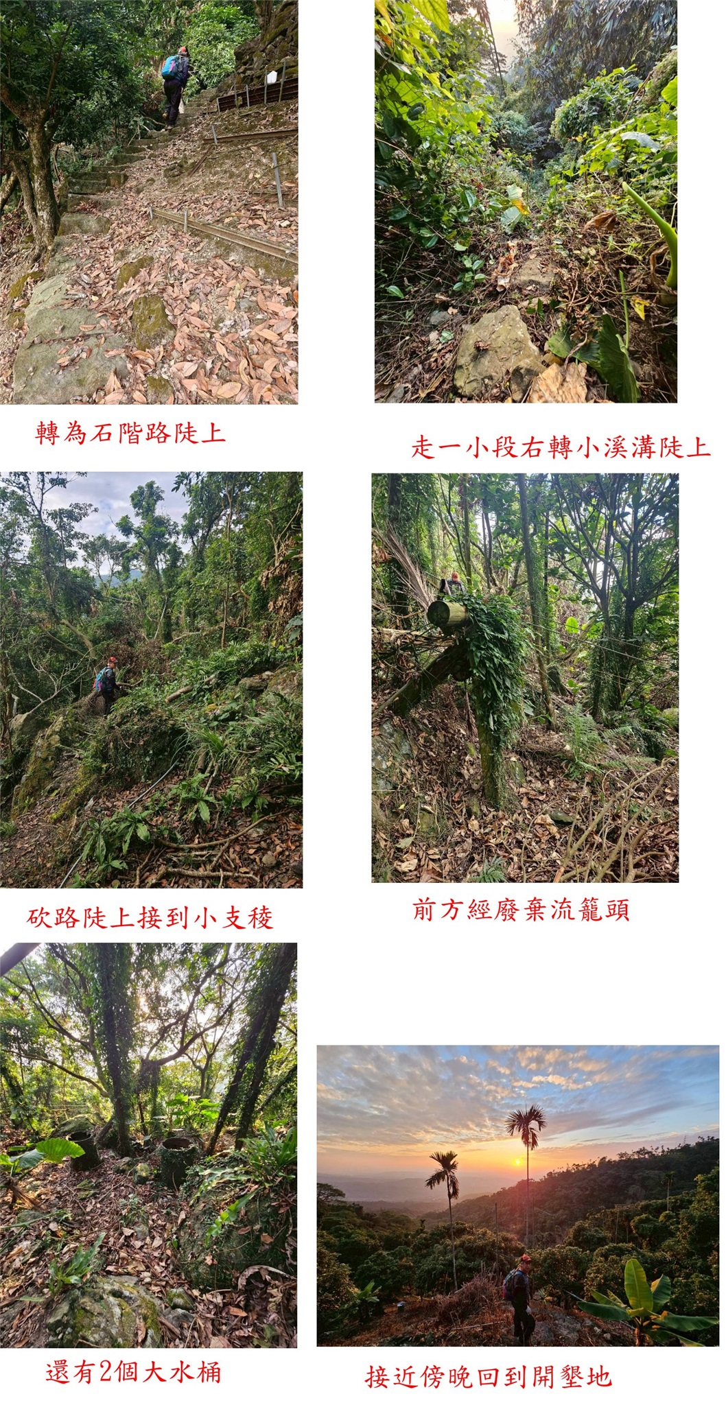 取右入廢棄檳榔園走70餘公尺,直攻太陡峭、取右小支稜上切至上方茶園,再取左茶園下緣橫繞,再陡下約
