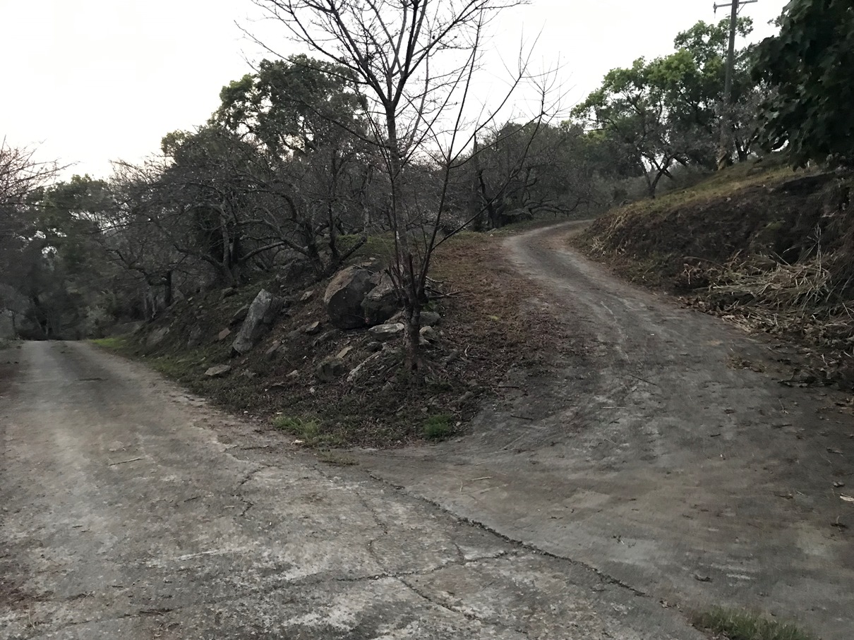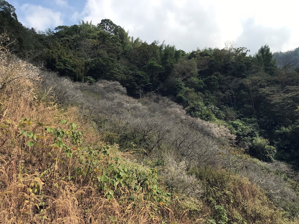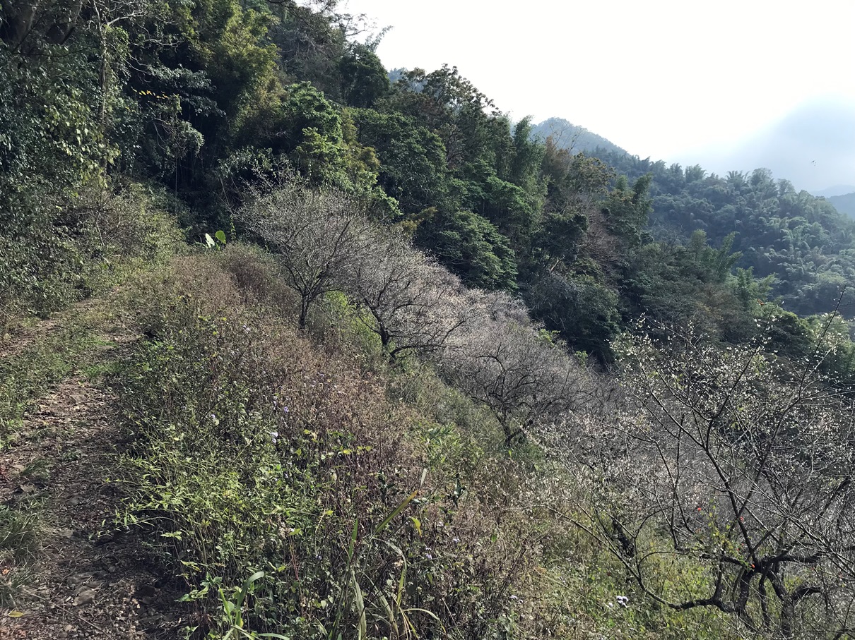 到梅林下方後再開始上坡,走約150公尺到大鐵皮蓄水桶的右彎處,繼續沿土石路之字形上坡,經梅林上緣,