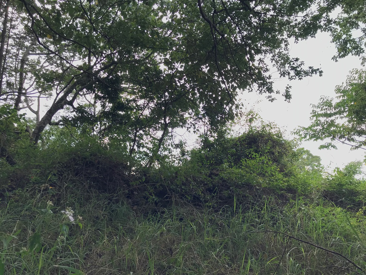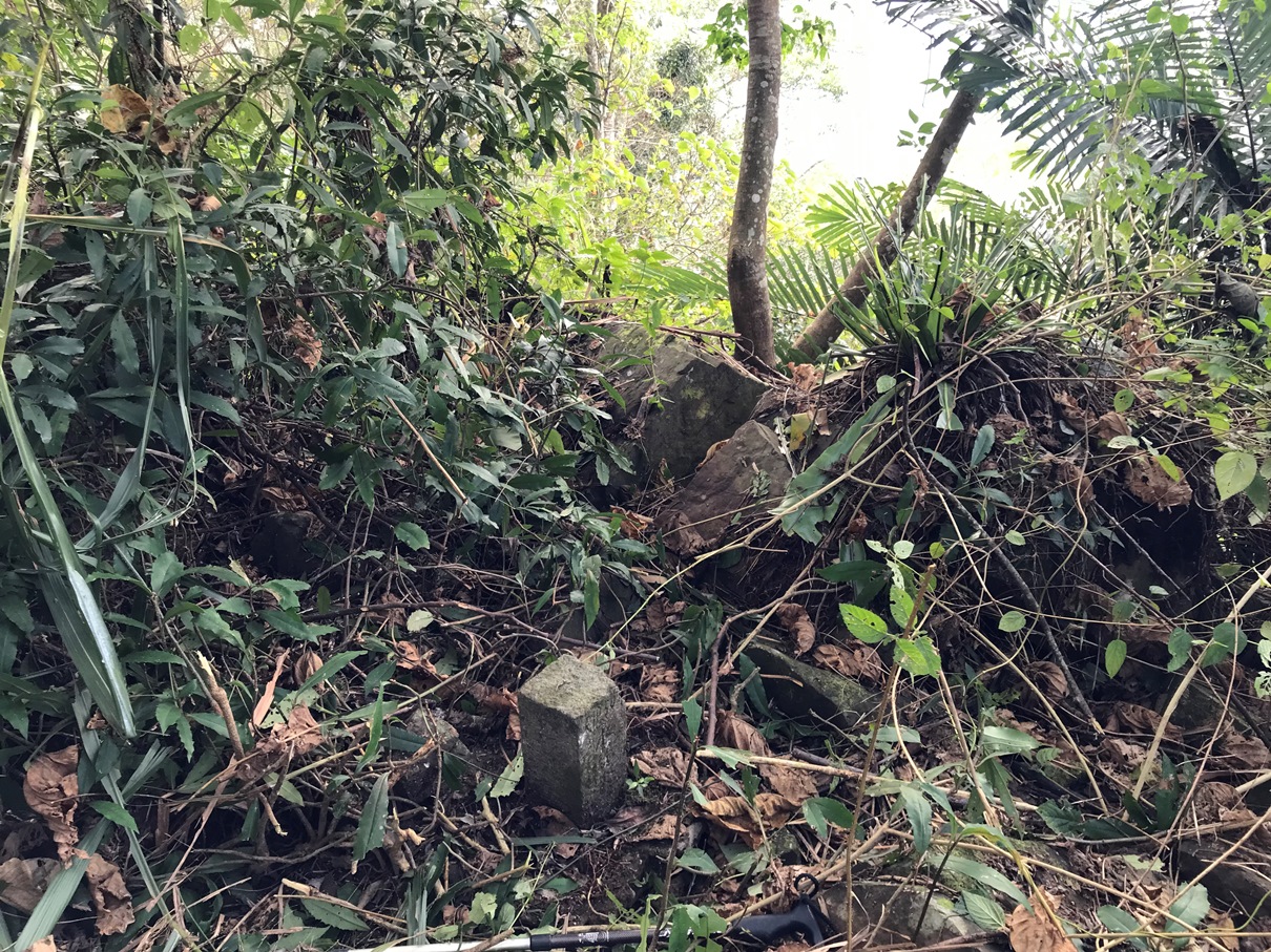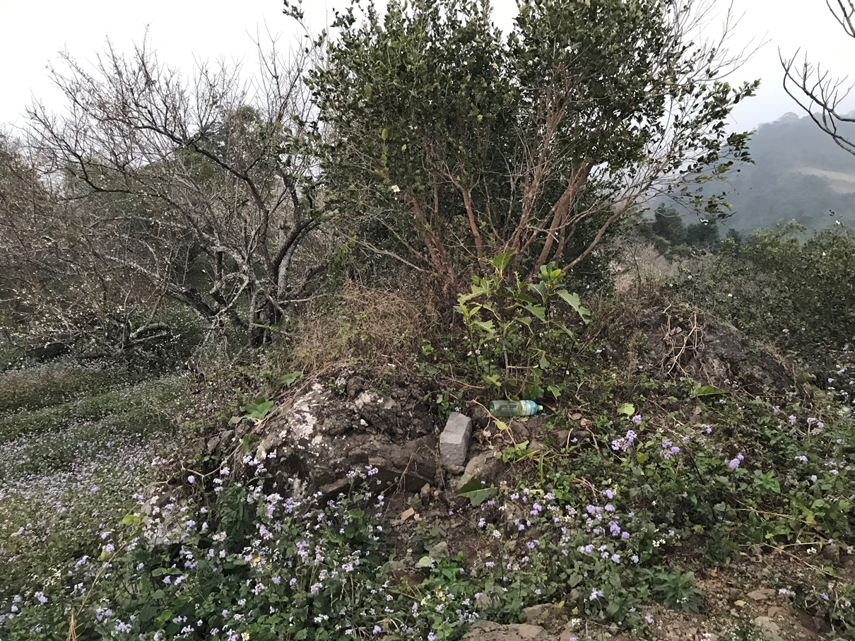 走約50公尺到開墾區南緣的樹林,進入樹林中的肩稜山頭,但基石不在此。肩稜西側有一處長滿雜草的石頭小丘,比肩稜山頭高,基石就在那邊。