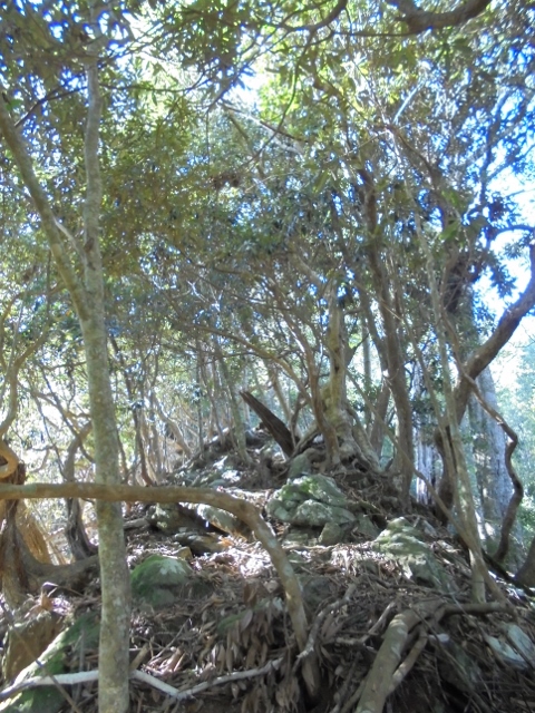 14:15 接上主稜後鑽行密箭竹內抵達1909峰,箭竹叢中偶爾有老舊的路條可以辨識