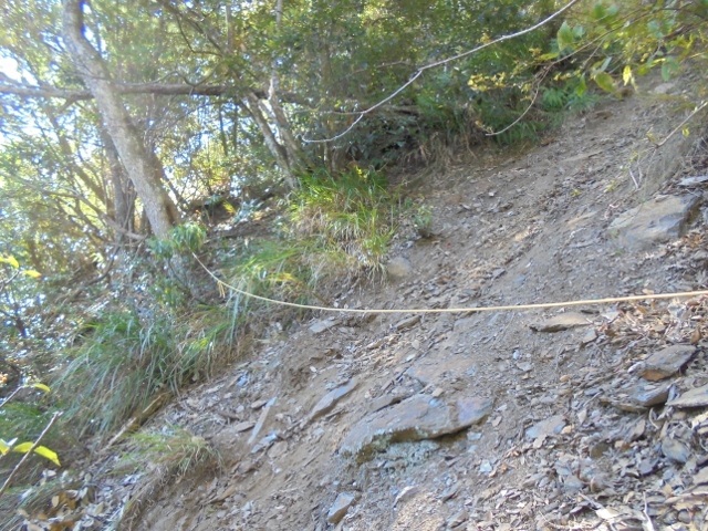 08:40 到達一大岩壁下方,必須往右腰繞接上防火巷,腰繞路有一段崩塌情況比初勘嚴重,架繩通過