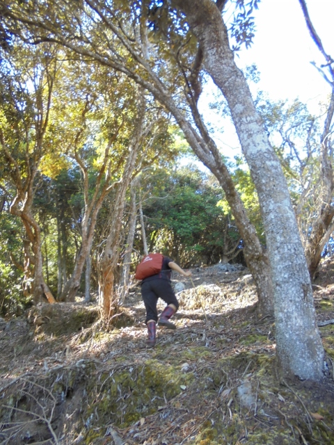 13:45 稜線持續陡升,通過幾處岩稜路段後密箭竹開始出現,越接近尾敏山主稜前可見隱約獵徑